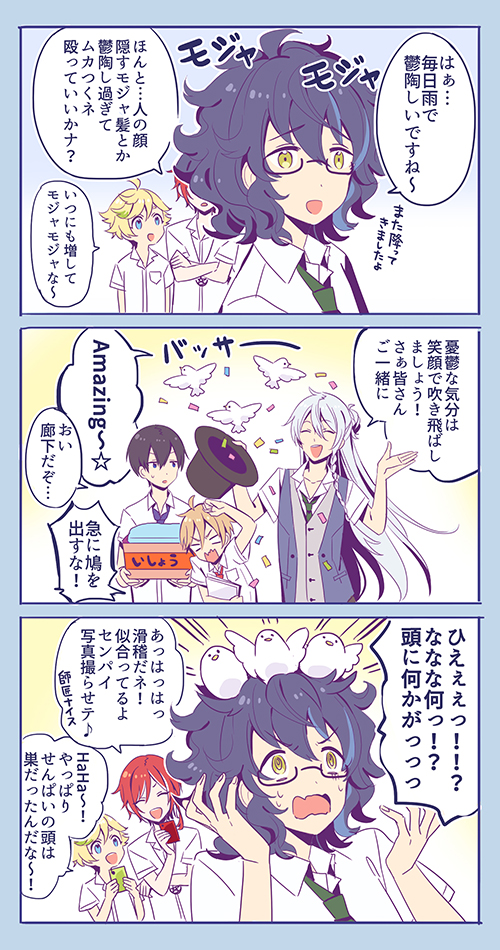3koma 6+boys :d :o ^_^ ahoge animal animal_on_head aoba_tsumugi bird bird_on_head black-framed_eyewear black_hair black_headwear blonde_hair blue_eyes blue_hair blue_necktie blue_vest braid breast_pocket cellphone closed_eyes collared_shirt comic commentary_request confetti crossed_arms dark_blue_hair ensemble_stars! glasses green_hair green_necktie hair_between_eyes hand_up hands_up harukawa_sora hat hibiki_wataru hidaka_hokuto holding holding_paper holding_phone holding_unworn_clothes holding_unworn_hat kina_(446964) laughing long_hair magic_trick male_focus mashiro_tomoya medium_hair multicolored_hair multiple_boys necktie on_head open_mouth paper phone pocket red_hair red_necktie sakasaki_natsume shirt short_hair short_sleeves side_braid smartphone smile speech_bubble streaked_hair sweatdrop switch_(ensemble_stars!) teeth top_hat translation_request unworn_hat unworn_headwear upper_body upper_teeth_only v-shaped_eyebrows vest white_shirt wing_collar