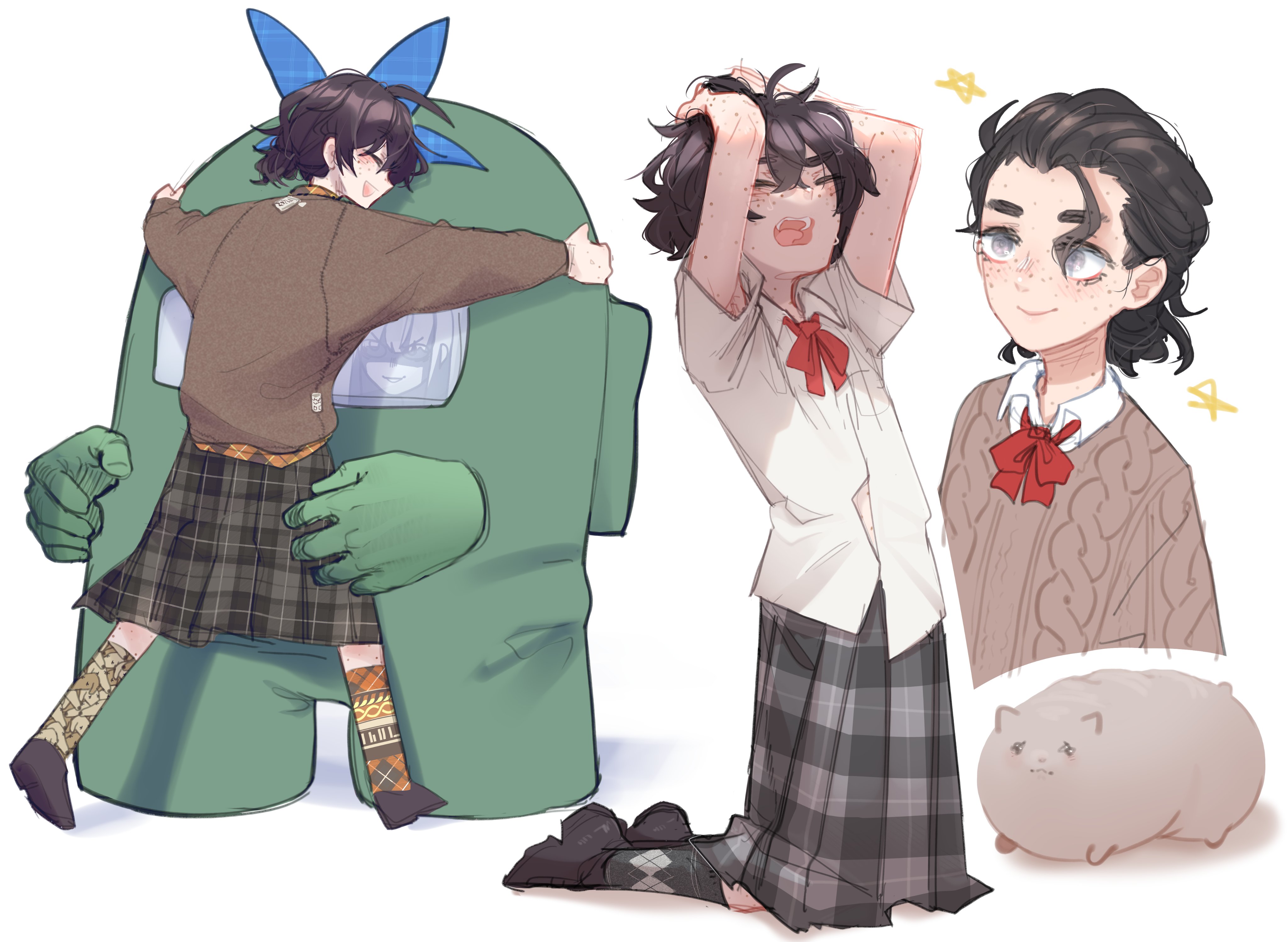 2girls :d absurdres among_us animal arms_up black_footwear black_hair sophie_(popopoka) erika_(popopoka) blue_hairband blush body_freckles bow bowtie brown_skirt brown_sweater cat cosplay crewmate_(among_us) crewmate_(among_us)_(cosplay) evil_grin evil_smile freckles grey_skirt grin hair_slicked_back hairband highres hug kneehighs kneeling long_sleeves multicolored_kneehighs multiple_girls multiple_views open_mouth plaid_clothes plaid_skirt popopoka price_tag red_bow red_bowtie shoes simple_background skirt smile socks star_(symbol) sweater tearing_up v-shaped_eyebrows white_background