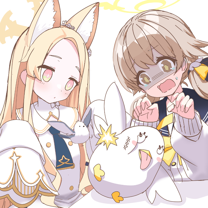 2girls animal_ear_fluff animal_ears bird blonde_hair blue_archive breasts cross_halo detached_sleeves fox_ears halo hifumi_(blue_archive) light_brown_hair long_hair long_sleeves low_twintails multiple_girls open_mouth peroro_(blue_archive) scared seia_(blue_archive) shooka simple_background small_breasts stuffed_animal stuffed_toy twintails white_background