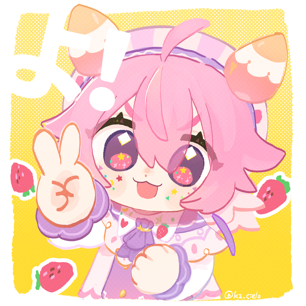 1girl :d ahoge beret blush_stickers chibi commentary_request dress facial_mark food fruit hair_between_eyes hat kiduta_cielo long_sleeves looking_at_viewer nijisanji open_mouth outline pink_hair purple_eyes smile solo star_(symbol) star_in_eye strawberry symbol_in_eye thick_eyebrows upper_body ushimi_ichigo v virtual_youtuber white_dress white_outline
