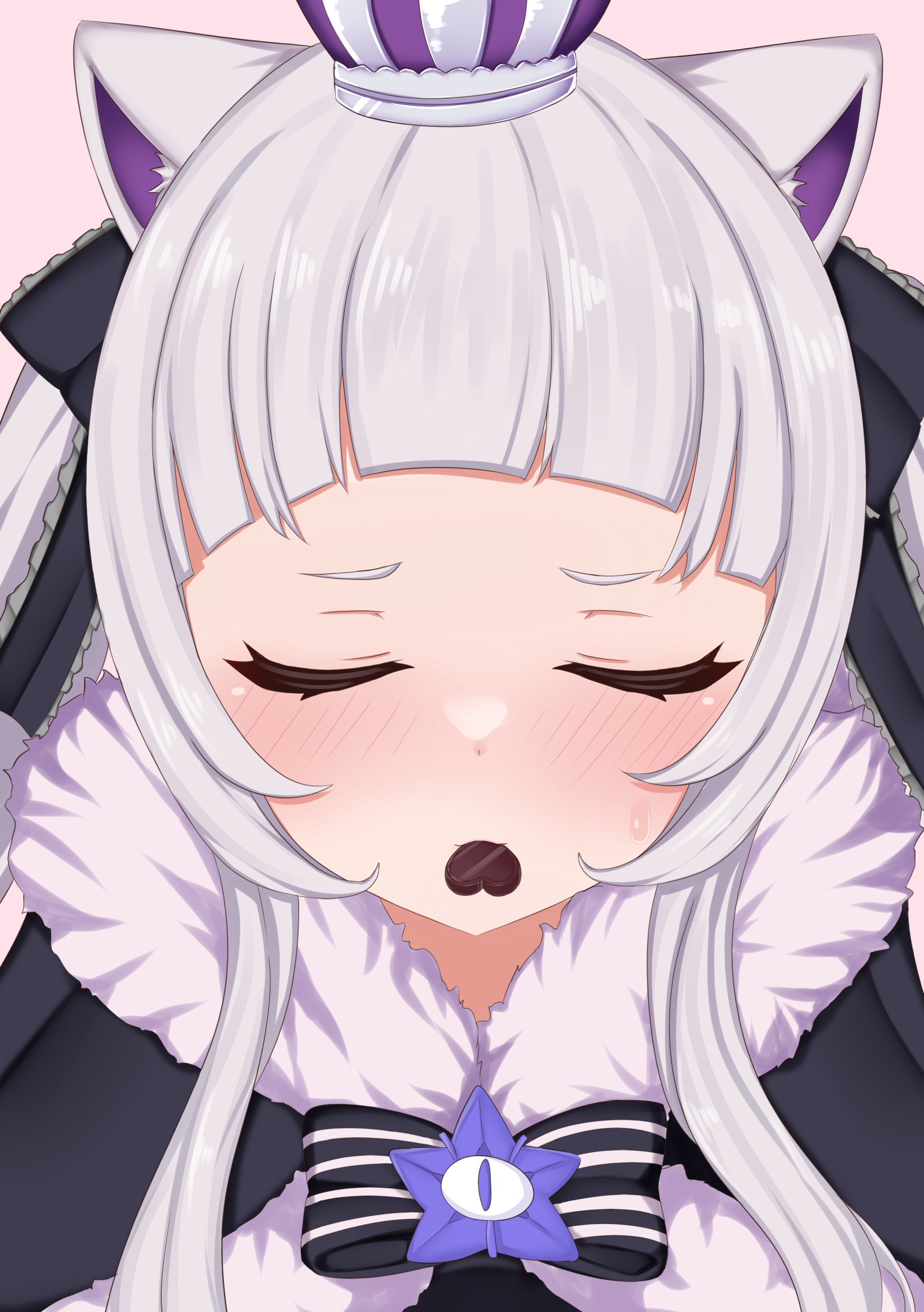 1girl absurdres akaki_tsubasa animal_ear_fluff animal_ears black_bow black_cloak blush bow candy cat_ears chocolate chocolate_heart cloak closed_eyes commentary_request crown facing_viewer food food_in_mouth forehead fur-trimmed_cloak fur_trim grey_hair hair_bow heart highres hololive long_hair mini_crown mouth_hold murasaki_shion murasaki_shion_(gothic_lolita) pink_background short_eyebrows simple_background solo sweat twintails upper_body valentine virtual_youtuber