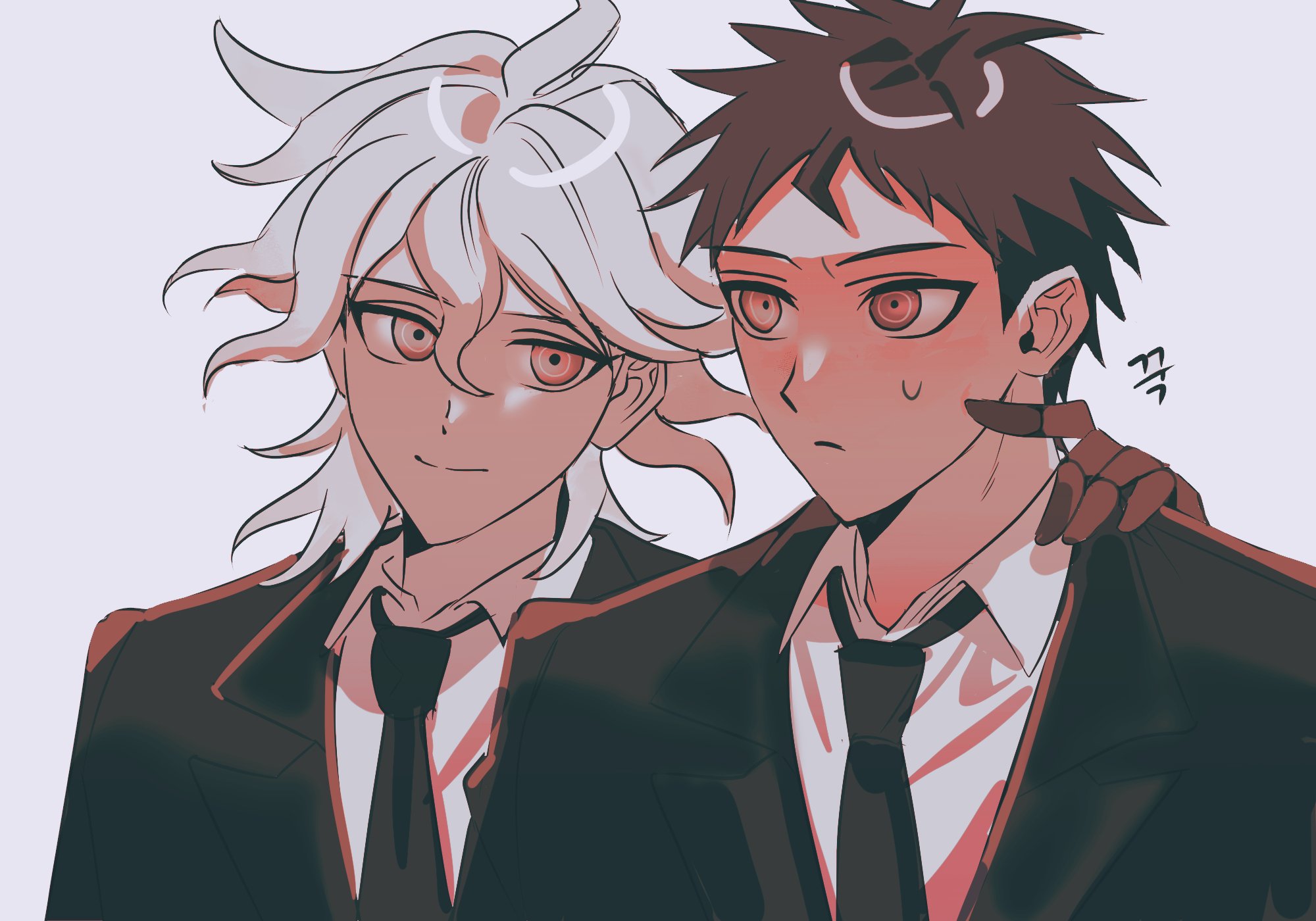 2boys ahoge black_jacket black_necktie brown_hair closed_mouth collared_shirt danganronpa_(series) danganronpa_2:_goodbye_despair flipped_hair frown grey_hair hair_between_eyes hand_on_another's_shoulder highres hinata_hajime jacket komaeda_nagito male_focus mattck medium_hair messy_hair multiple_boys necktie red_eyes shirt short_hair simple_background sweatdrop translation_request white_background white_shirt
