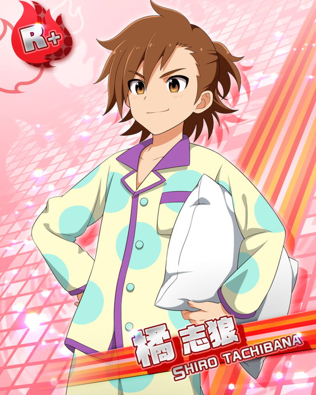 1boy blush breast_pocket brown_eyes brown_hair buttons card_(medium) character_name child holding holding_pillow idolmaster idolmaster_side-m male_focus official_alternate_costume official_art pajamas pillow pink_background pocket polka_dot polka_dot_pajamas smile solo tachibana_shiro_(idolmaster)