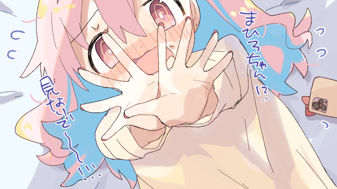 1girl @_@ blue_hair blush cellphone cezf28 commentary embarrassed flying_sweatdrops from_above hair_between_eyes hair_down hozuki_kaede long_hair looking_at_viewer lying multicolored_hair nose_blush on_back onii-chan_wa_oshimai! open_mouth outstretched_arms phone pink_eyes pink_hair sketch smartphone solo translated two-tone_hair wavy_mouth