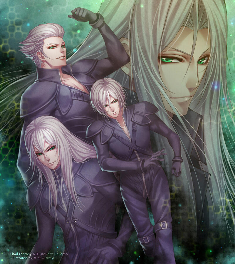 4boys aimio_nagi armor black_bodysuit black_gloves bodysuit bracer buckle chest_harness final_fantasy final_fantasy_vii final_fantasy_vii:_advent_children full-length_zipper gloves green_eyes grey_hair grin harness kadaj loz male_focus multiple_boys pauldrons sephiroth shoulder_armor smile smirk yazoo zipper