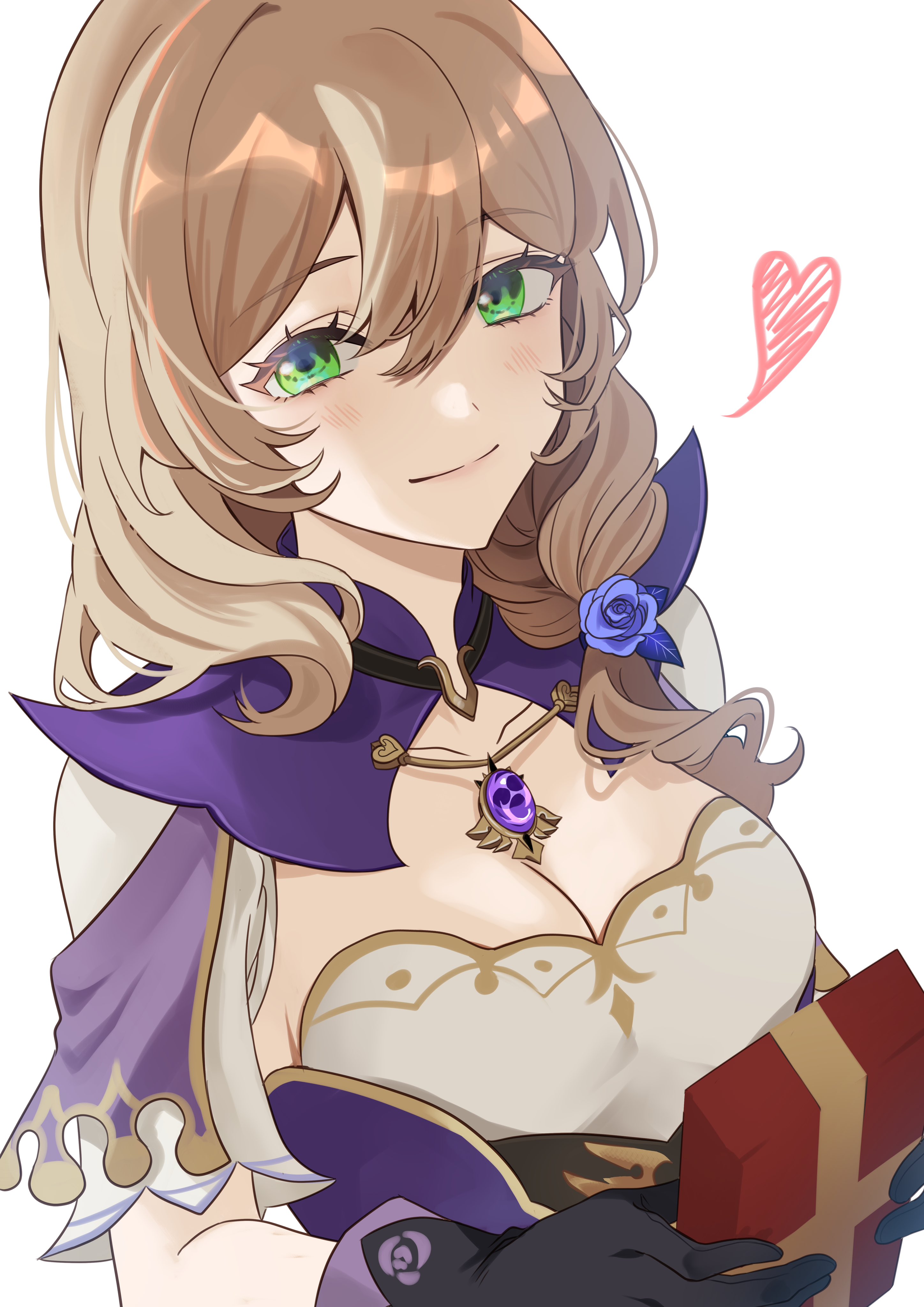 1girl absurdres black_gloves blue_flower blue_rose blush box breasts brown_hair cleavage closed_mouth commentary dress eyelashes flower framed_breasts genshin_impact gift gift_box gloves green_eyes hair_between_eyes hair_flower hair_ornament hair_over_shoulder heart highres lisa_(genshin_impact) looking_at_viewer medium_breasts medium_hair mitsudomoe_(shape) rose simple_background smile solo untranslatable_commentary tomoe_(symbol) upper_body valentine vision_(genshin_impact) white_background yamabuki0211