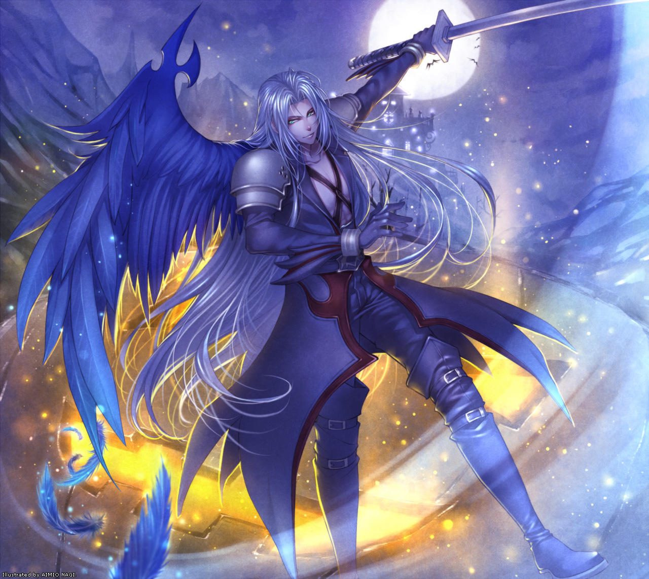 1boy aimio_nagi armor bat_(animal) belt belt_boots black_coat black_footwear black_gloves black_pants black_wings boots bracer buckle coat feathered_wings feathers final_fantasy final_fantasy_vii full_moon gloves glowing green_eyes grey_hair hill holding holding_sword holding_weapon jack-o'-lantern katana kingdom_hearts long_coat long_hair male_focus mansion moon night pants pauldrons pumpkin sephiroth shoulder_armor single_wing sky sword thigh_boots weapon wings