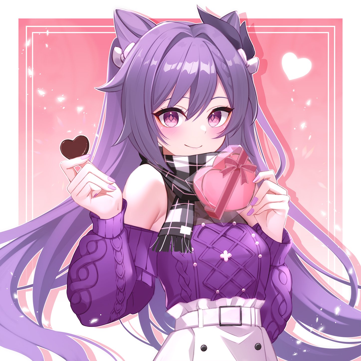 1girl alternate_costume bare_shoulders chocolate double_bun genshin_impact hair_bun highres keqing_(genshin_impact) keqing_(lantern_rite)_(genshin_impact) long_sleeves looking_at_viewer purple_eyes purple_hair smile solo twintails tyenka7728