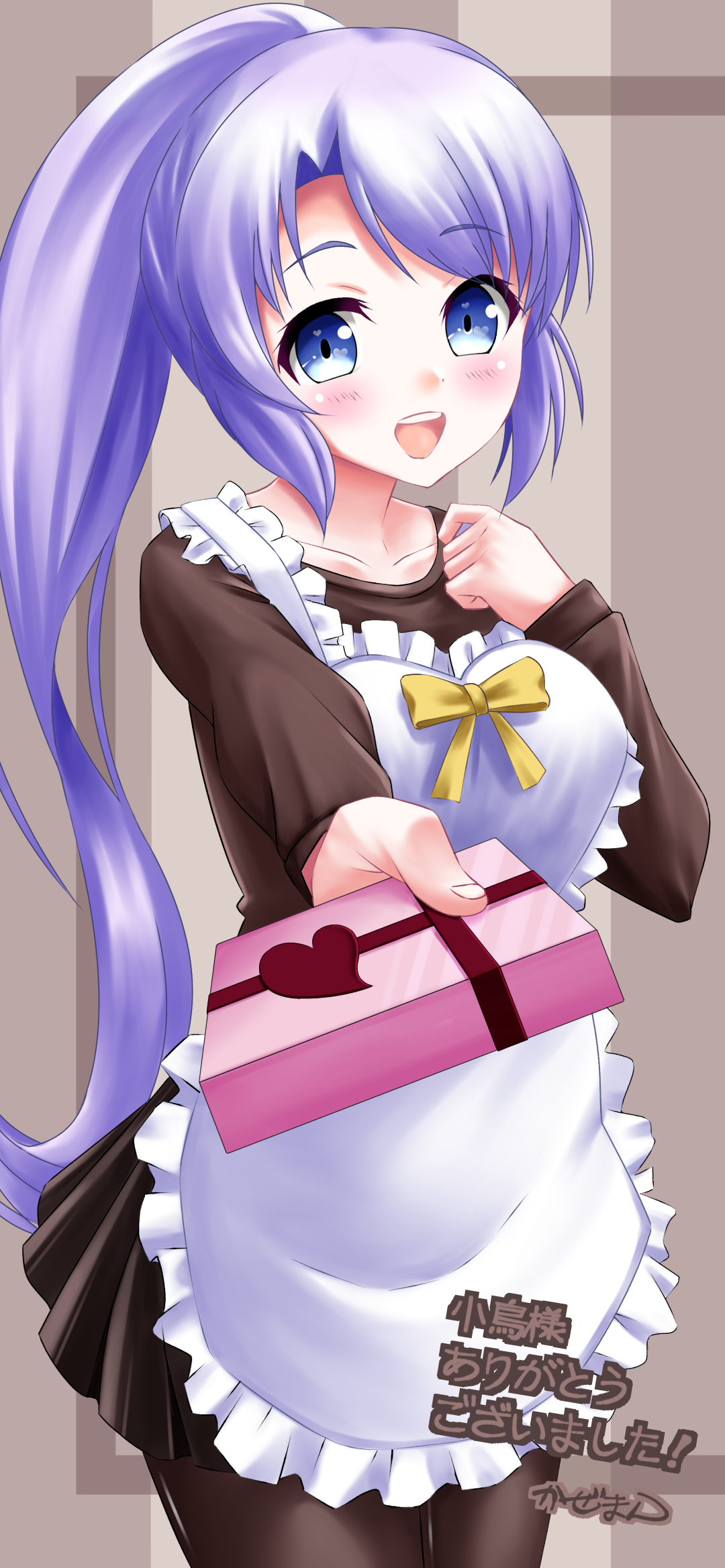1girl :d apron black_skirt blue_eyes blue_hair blush bow box breasts brown_background brown_pantyhose brown_shirt commentary_request frilled_apron frills gift gift_box heart highres holding holding_gift iris_mysteria! kaze_makase long_hair looking_at_viewer medium_breasts open_mouth outstretched_arm pantyhose patricia_shandy pleated_skirt ponytail shirt skirt smile solo sweat translation_request valentine very_long_hair white_apron yellow_bow