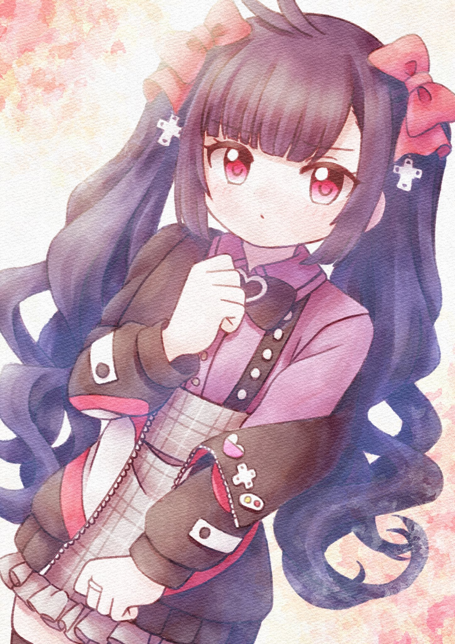1girl ahoge black_bow black_bowtie black_jacket blunt_bangs blush bow bowtie buttons chizu_ranka chizu_ranka_(winter_costume) closed_mouth collared_shirt cowboy_shot d-pad d-pad_hair_ornament dot_mouth dutch_angle faux_traditional_media frilled_skirt frills grey_skirt hair_bow hair_ornament hand_up highres jacket jewelry katsuonoeboebo long_hair long_sleeves looking_at_viewer magia_record:_mahou_shoujo_madoka_magica_gaiden mahou_shoujo_madoka_magica miniskirt multicolored_jacket no_nose pink_background pink_shirt plaid_clothes plaid_skirt red_bow red_eyes ring shirt sidelocks skindentation skirt solo suspenders twintails very_long_hair wavy_hair zipper