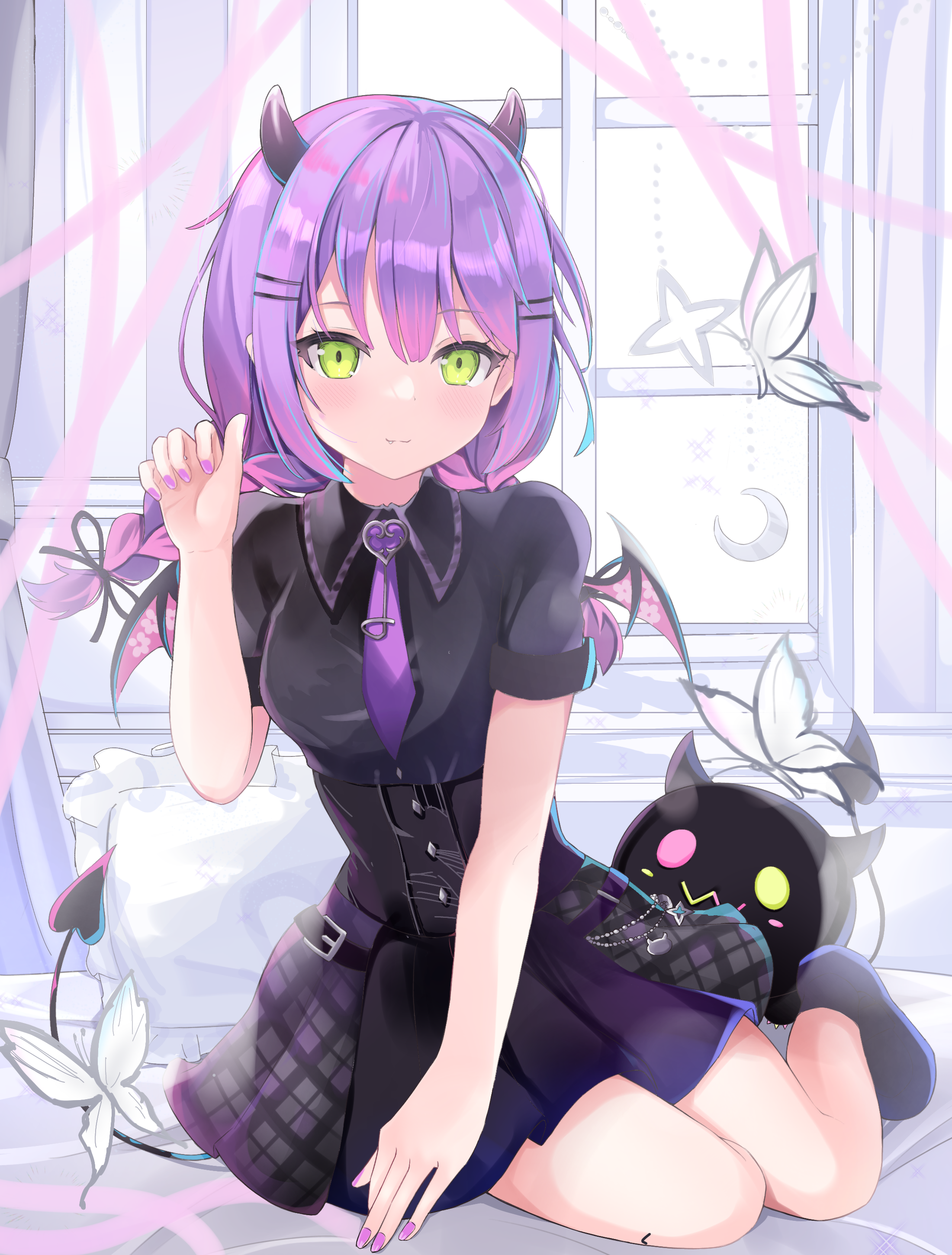 1girl absurdres bibi_(tokoyami_towa) black_jacket black_shirt black_skirt blazer blush bug butterfly crescent_moon demon_girl demon_horns demon_tail demon_wings fang green_eyes hair_ornament hairpin highres hololive horns insect jacket long_hair looking_at_viewer miniskirt moon nail_polish necktie nekopurin_(nyanko_prin) pink_hair pink_nails ponytail purple_necktie school_uniform shirt side_ponytail skirt smile solo tail tokoyami_towa tokoyami_towa_(underworld_uniform) virtual_youtuber wings