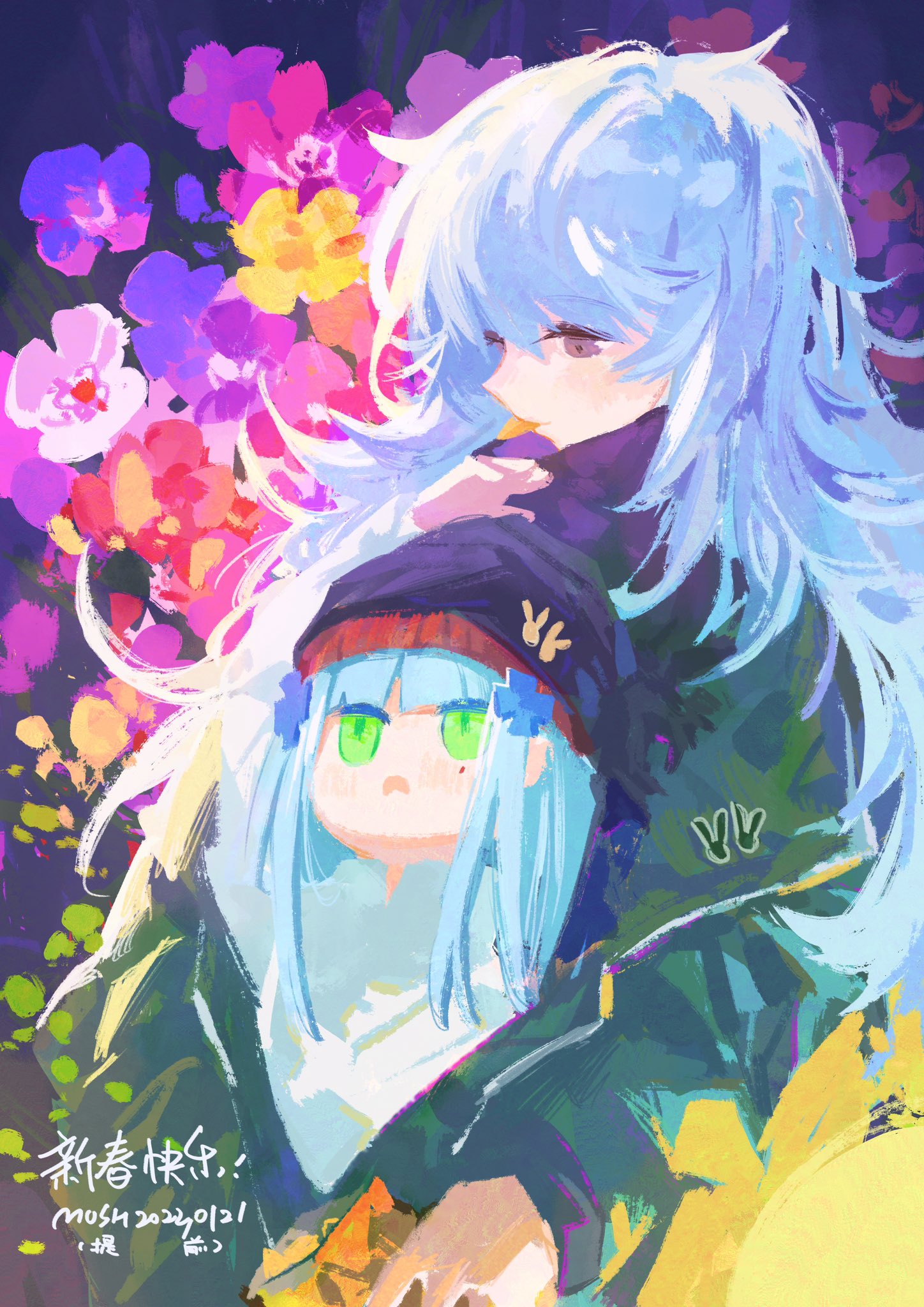 2girls aged_down beanie commentary_request eating floral_background g11_(girls'_frontline) girls'_frontline green_eyes green_jacket grey_hair hair_ornament hat highres hk416_(girls'_frontline) jacket long_hair looking_at_another messy_hair multiple_girls mush_(fingalphoneix) open_mouth role_reversal upper_body