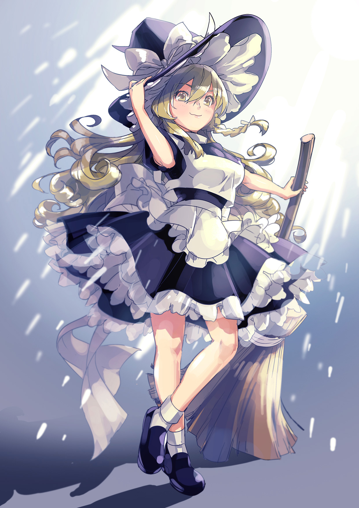 1girl adjusting_clothes adjusting_headwear apron black_footwear black_hat black_skirt blonde_hair bow braid broom frilled_skirt frills full_body hat hat_bow highres holding holding_broom kirisame_marisa long_hair sansintei_auto shirt single_braid skirt smile socks solo touhou waist_apron white_apron white_bow white_shirt witch_hat yellow_eyes