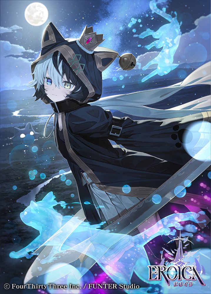 1girl animal_hood black_hair blue_eyes cat cat_hood crown eroica full_moon heterochromia hood hood_up moon multicolored_hair nero_(eroica) official_art short_hair skirt slit_pupils solo two-tone_hair wasabi60 white_hair white_skirt yellow_eyes