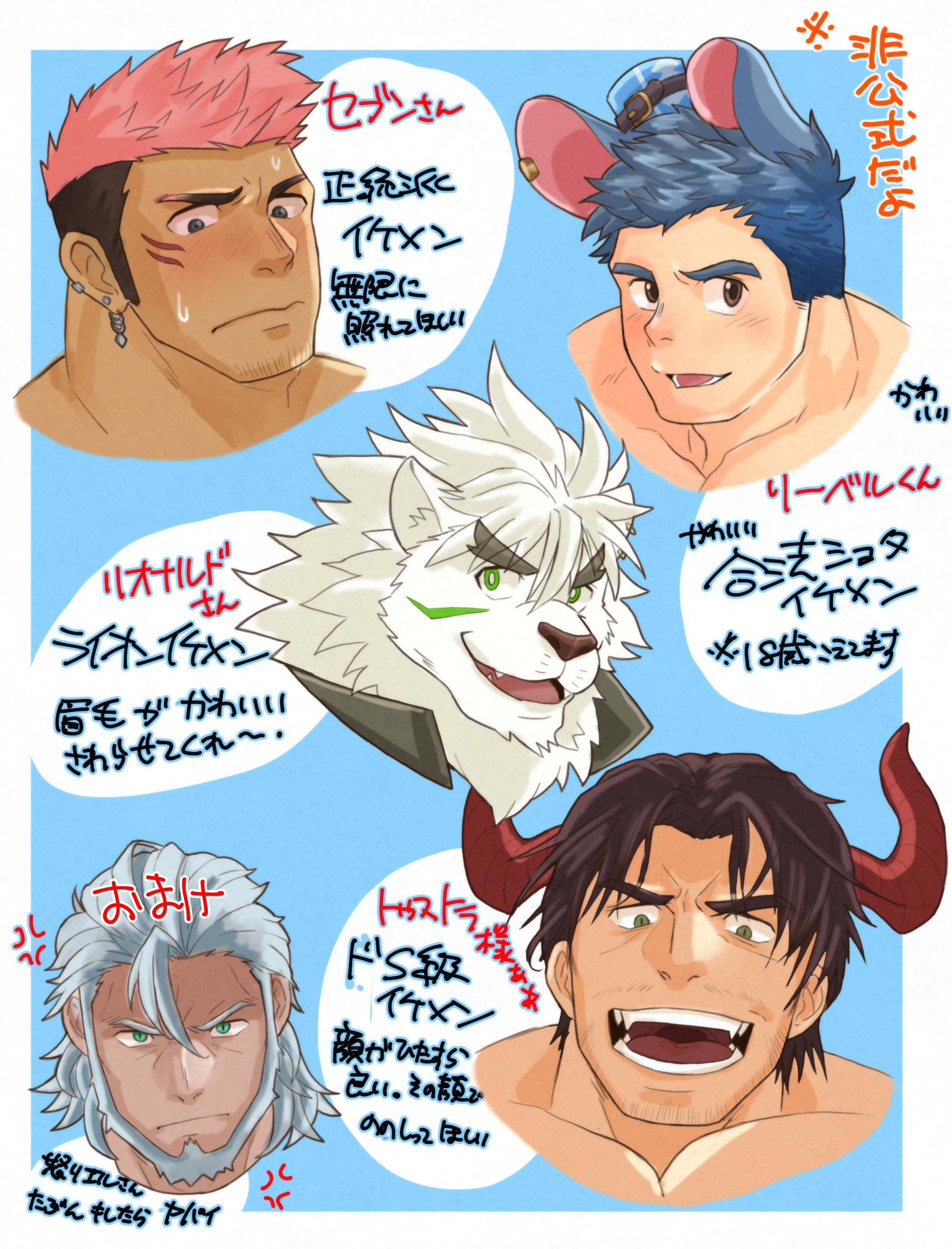 5boys absurdres animal_ears bara beard blue_hair blush brown_hair character_request collage crave_saga cropped_shoulders dark-skinned_male dark_skin demon_boy demon_horns earrings facial_hair fang frown furry furry_male grey_hair hat highres horns jewelry laughing lion_boy lion_ears lionardo_(crave_saga) long_sideburns male_focus mature_male mini_hat mouse_boy mouse_ears multicolored_hair multiple_boys muscular muscular_male pink_hair raineru_(gryffindor131) river_(crave_saga) seven_(crave_saga) short_hair sideburns smile thick_eyebrows translation_request tuxtla_(crave_saga) two-tone_hair white_fur