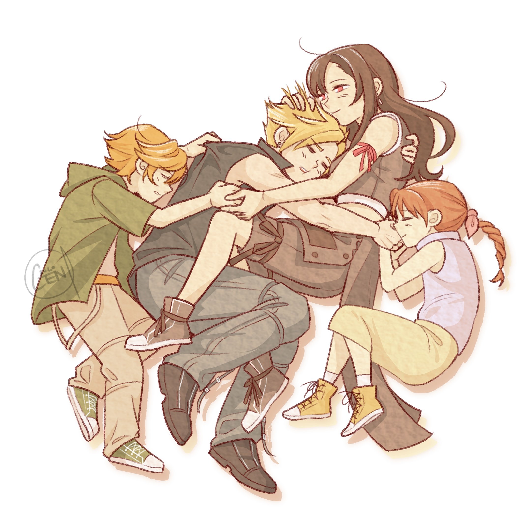 2boys 2girls apron arm_ribbon bare_shoulders black_hair black_shorts blonde_hair braid braided_ponytail brown_hair child closed_eyes cloud_strife crop_top cuddling denzel_(ff7) earrings family final_fantasy final_fantasy_vii final_fantasy_vii:_advent_children full_body gen_(gala_itazura) hair_ribbon headpat high_collar highres hug jewelry long_hair lying marlene_wallace multiple_boys multiple_girls on_side pink_ribbon red_eyes red_ribbon ribbon shorts sleeveless smile square_enix tifa_lockhart waist_apron