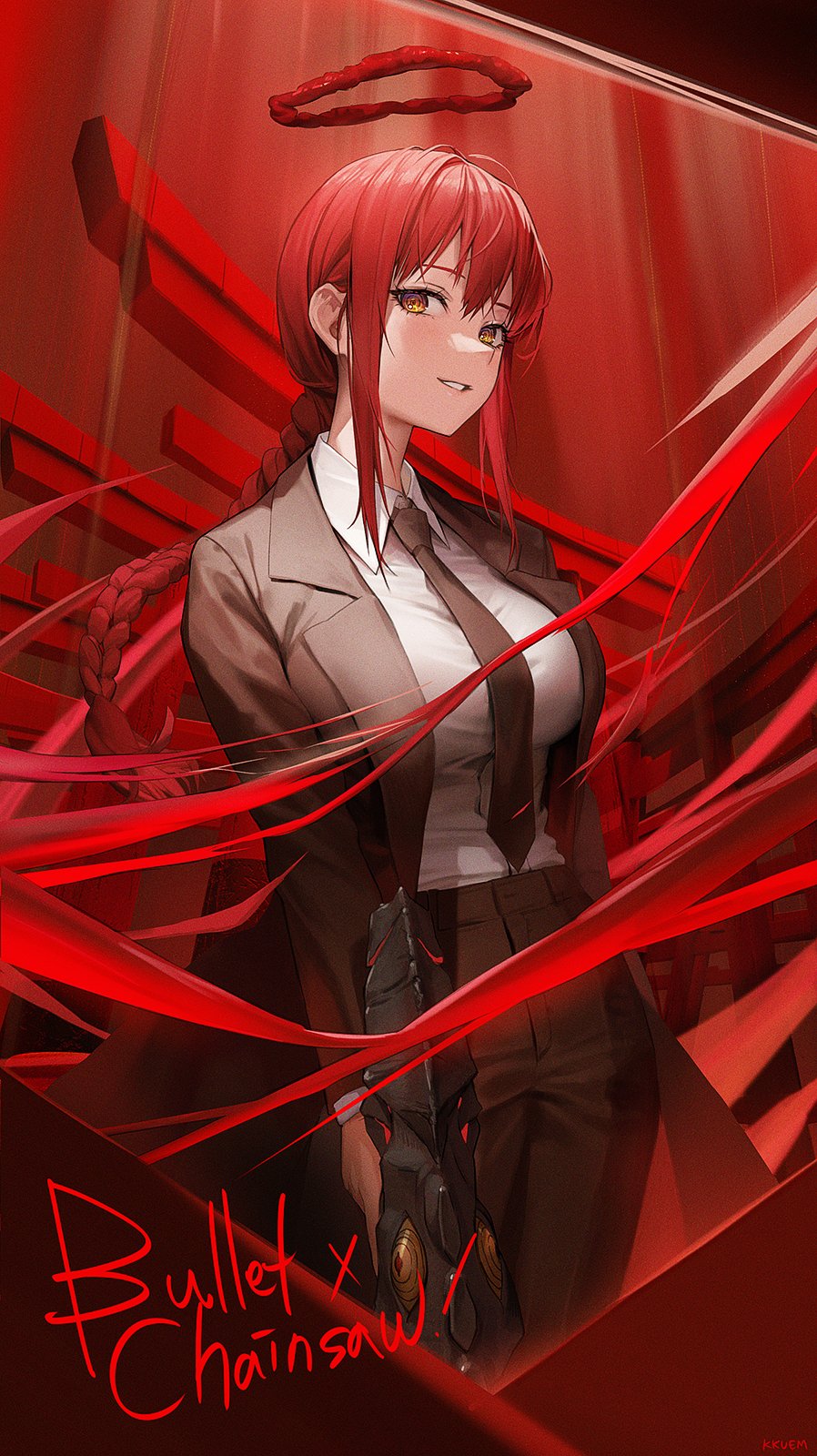 1girl black_necktie black_pants braid braided_ponytail breasts business_suit chainsaw_man collared_shirt formal_clothes goddess_of_victory:_nikke grin gun halo high-waist_pants highres holding holding_gun holding_weapon kkuem large_breasts makima_(chainsaw_man) necktie office_lady pants red_hair red_halo ringed_eyes shirt shirt_tucked_in sidelocks smile solo suit weapon yellow_eyes