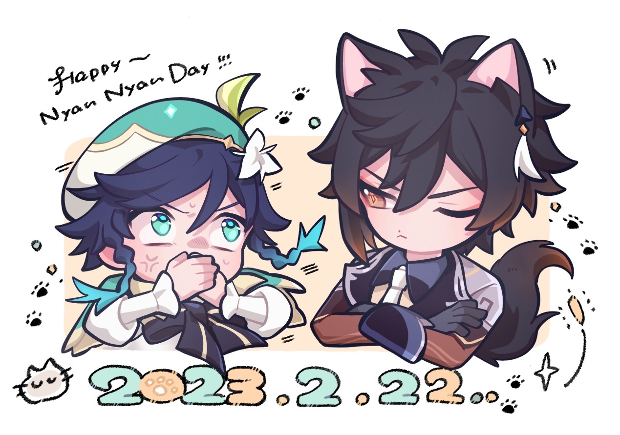 2boys anger_vein animal_ears antenna_hair aqua_eyes aqua_hair b_bmvp brown_hair cape cat_day cat_ears cat_tail covering_own_mouth crossed_arms earrings genshin_impact gradient_hair green_cape green_headwear jewelry long_sleeves looking_at_another multicolored_hair multiple_boys one_eye_closed sidelocks single_earring sweatdrop tail tassel tassel_earrings venti_(genshin_impact) zhongli_(genshin_impact)