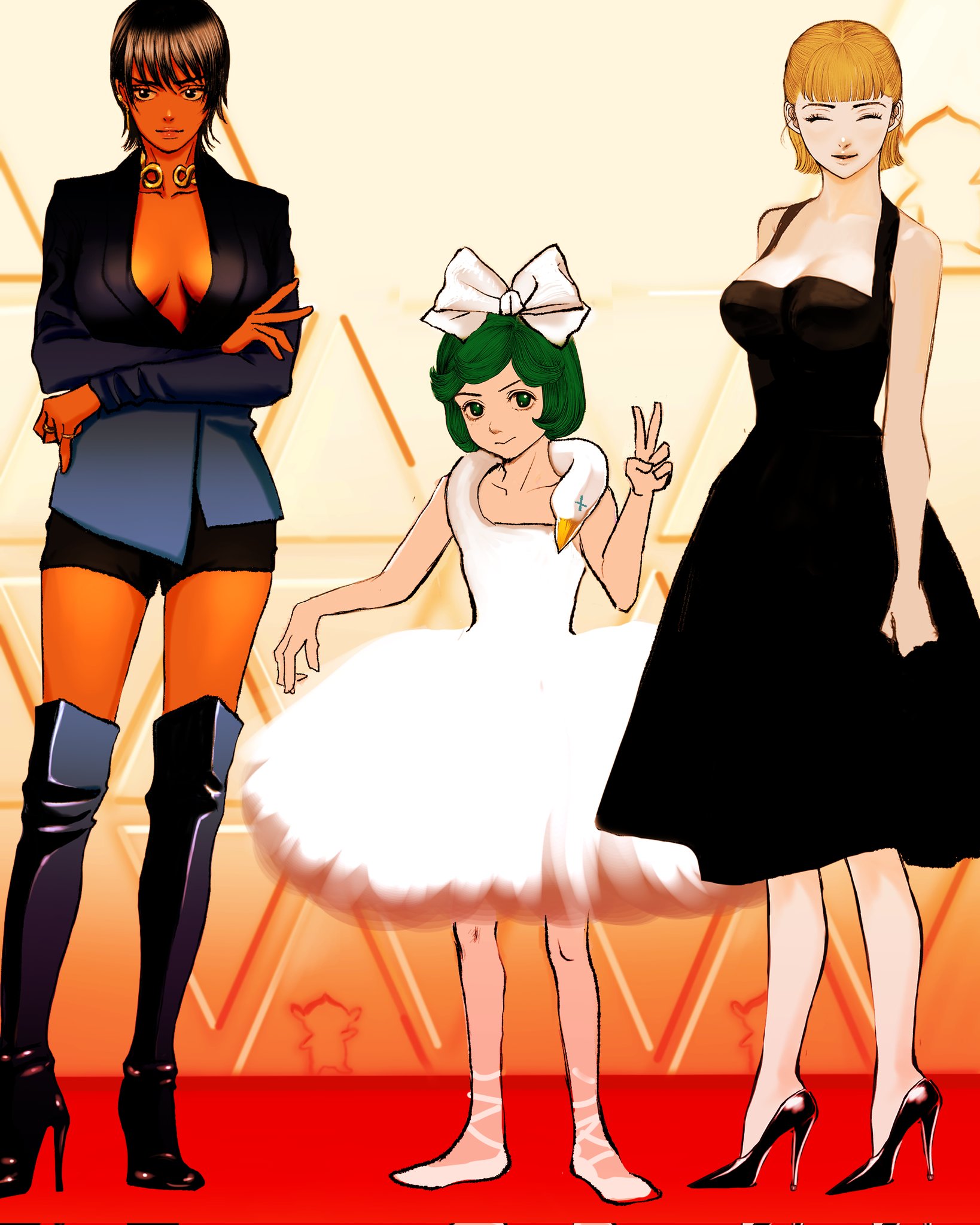 3girls arm_at_side ballet_slippers bare_legs berserk bird black_dress black_eyes black_footwear black_hair black_jacket black_shorts blonde_hair bob_cut boots bow breasts casca_(berserk) cleavage closed_eyes cocktail_dress corrupted_twitter_file crossed_arms dark-skinned_female dark_skin dress farnese_(berserk) formal_clothes green_hair hair_bow hand_up high_heel_boots high_heels highres jacket jewelry light_smile looking_at_viewer mascot medium_breasts multiple_girls necklace nisino2222 no_shirt party pixie_cut plunging_neckline red_carpet schierke_(berserk) short_dress short_hair shorts sleeveless standing swan the_academy_awards tutu v white_bow white_dress white_footwear
