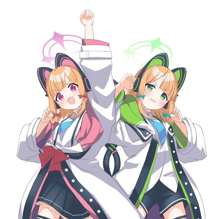 2girls animal_ear_headphones animal_ears arm_up black_shorts black_skirt black_thighhighs blonde_hair blue_archive blue_necktie blush bow cat_day claw_pose collared_shirt commentary_request dress_shirt fake_animal_ears green_eyes hair_bow halo hands_up head_tilt headphones jacket long_sleeves looking_at_viewer midori_(blue_archive) momoi_(blue_archive) multiple_girls necktie open_clothes open_jacket pleated_skirt red_bow red_eyes shirt shooka short_shorts shorts siblings sidelocks simple_background sisters skirt suspender_skirt suspenders thighhighs v-shaped_eyebrows white_background white_jacket white_shirt wide_sleeves