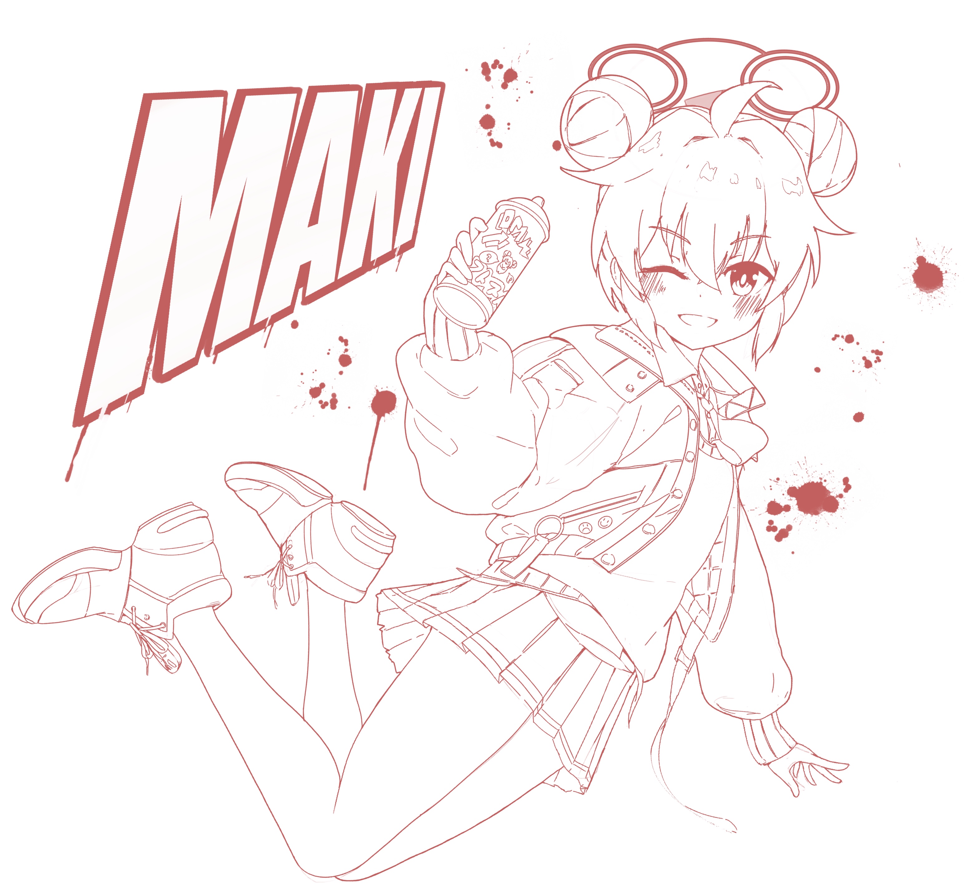 1girl absurdres bare_legs blue_archive blush can character_name double_bun full_body grin hair_between_eyes hair_bun halo highres holding holding_can jacket lineart long_sleeves looking_at_viewer maki_(blue_archive) monochrome necktie one_eye_closed open_clothes open_jacket paint_splatter patanda pleated_skirt red_theme shoes short_hair simple_background skirt smile sneakers solo spray_can white_background