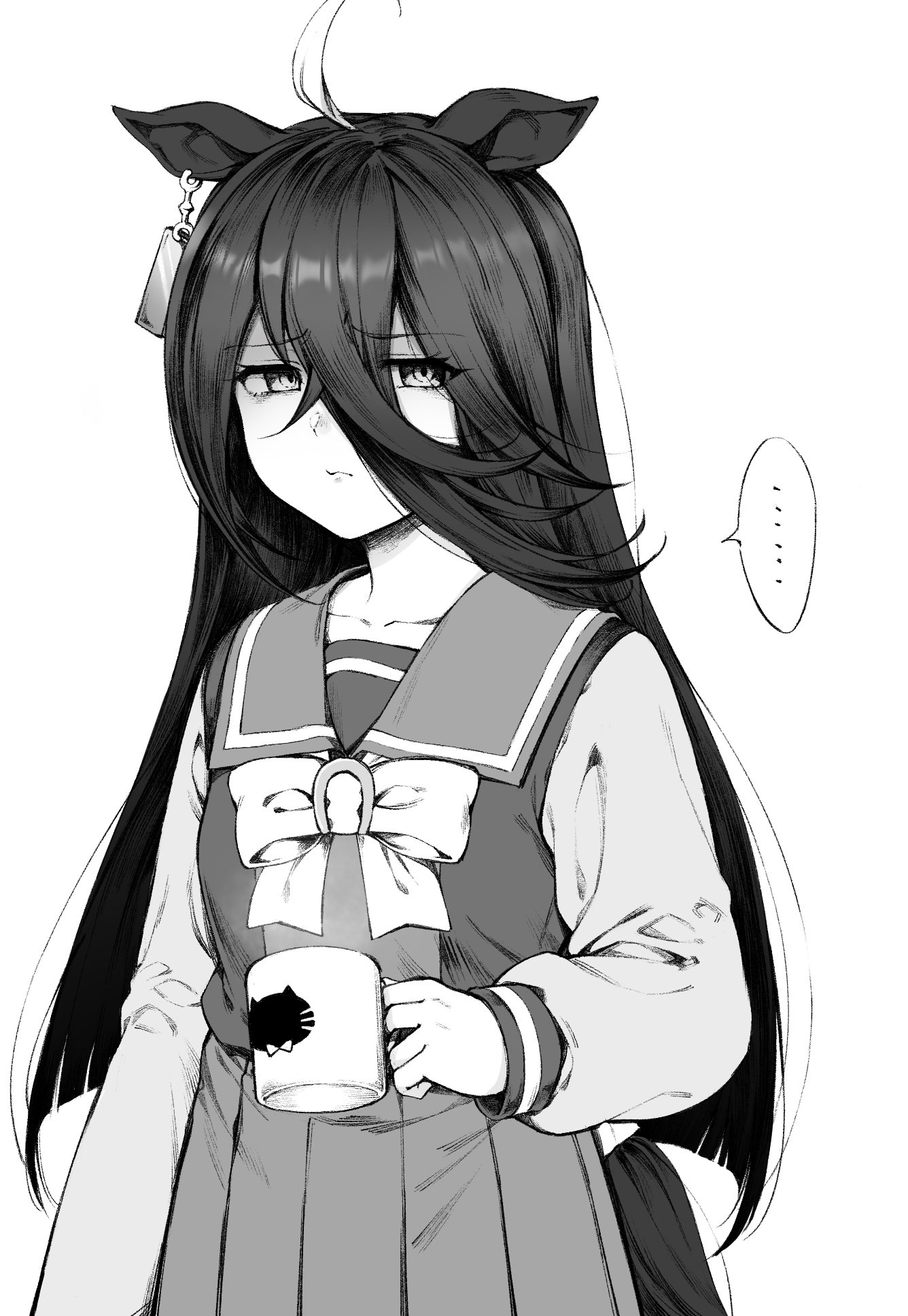 ... 1girl ahoge animal_ears annoyed breasts closed_mouth collarbone commentary cup hair_between_eyes highres horse_ears horse_tail looking_at_viewer manhattan_cafe_(umamusume) monochrome mug nihudau school_uniform simple_background small_breasts solo tail tracen_school_uniform umamusume white_background