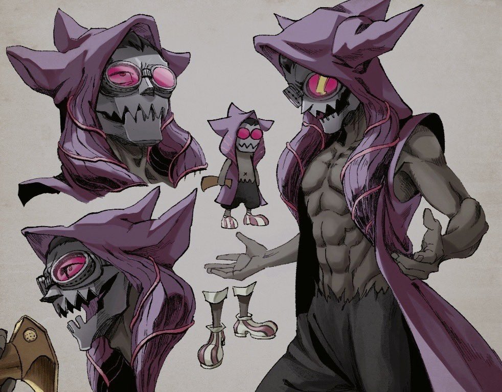 1boy abs black_fur reference_sheet chibi chibi_inset colored_skin fake_horns fur-trimmed_pants fur_trim gjallarhorn goggles grey_skin hair_slicked_back heimdall_(shuumatsu_no_valkyrie) hood hood_up horned_headwear horned_hood horns kurotake_ihi male_focus muscular muscular_male navel open_hands open_mouth pants sharp_teeth shoes short_hair shuumatsu_no_valkyrie sleeveless striped_clothes striped_footwear teeth