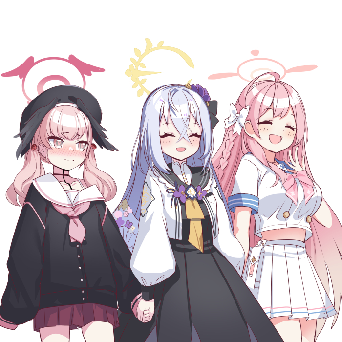 3girls :d ahoge angel_wings azusa_(blue_archive) beret black_bow black_headwear black_sailor_collar black_skirt blue_archive blush bow bowtie breasts closed_eyes commentary_request flower hair_bow hair_flower hair_ornament halo hanako_(blue_archive) hat head_wings holding_hands koharu_(blue_archive) large_breasts long_hair low_wings multiple_girls neckerchief off_shoulder open_mouth pink_bow pink_bowtie pink_eyes pink_hair pink_neckerchief pleated_skirt sailor_collar shirt shirt_overhang shooka skirt smile twintails white_bow white_hair white_sailor_collar white_shirt white_wings wing_ornament wings