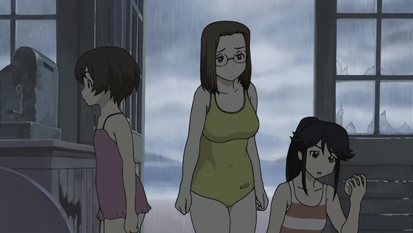 3girls animated animated_gif ass bent_over black_hair breasts brown_hair closed_mouth glasses hitotsubashi_yurie innertube kamichu! legs medium_breasts multiple_girls one-piece_swimsuit open_mouth rain saegusa_matsuri shijou_mitsue short_hair small_breasts swim_ring swimsuit yellow_one-piece_swimsuit