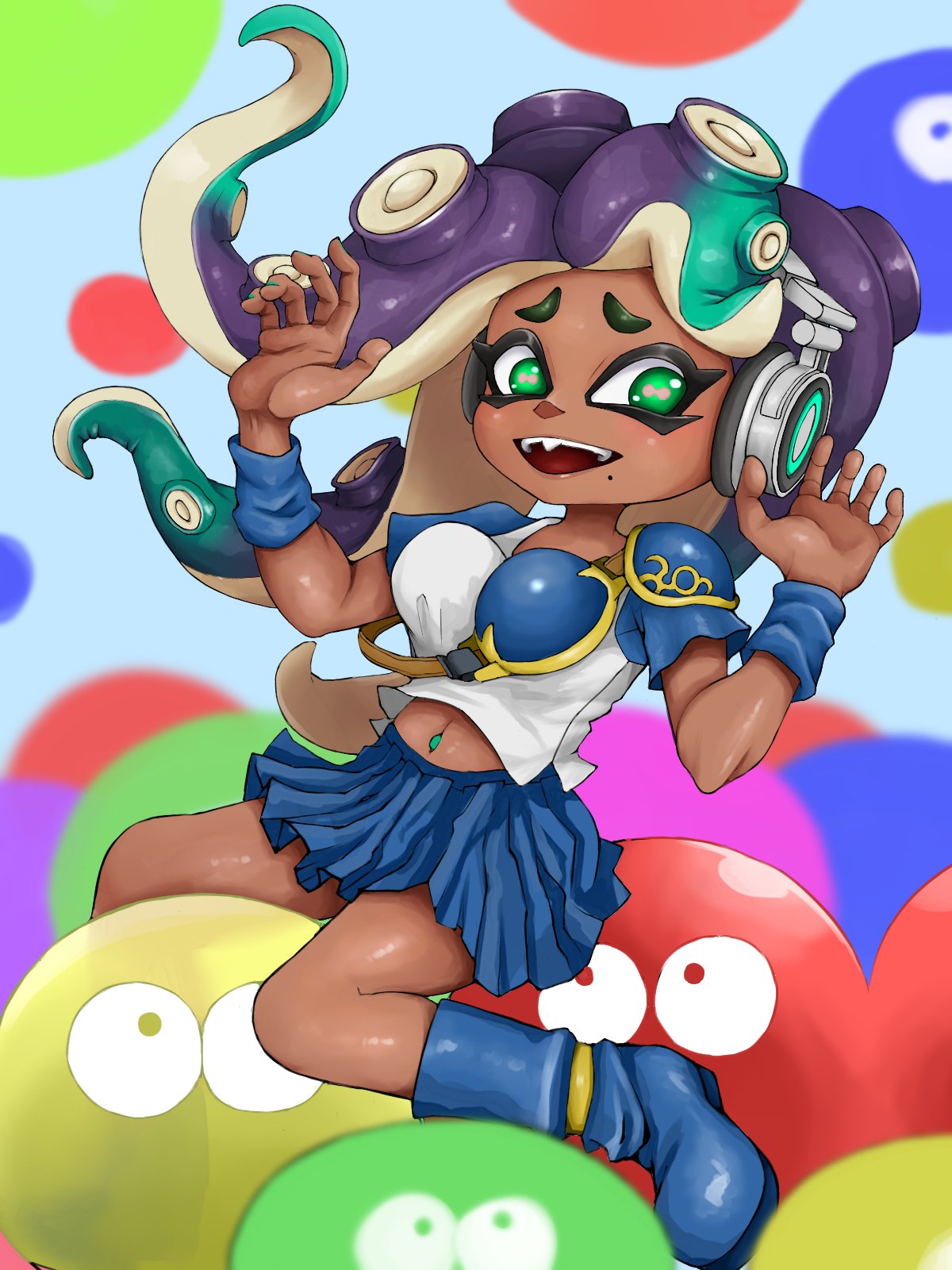 1girl arle_nadja arle_nadja_(cosplay) boots breasts cosplay crossover dark-skinned_female dark_skin green_eyes highres marina_(splatoon) medium_breasts nintendo puyo_(puyopuyo) puyopuyo sheoknight short_sleeves skirt splatoon_(series) tentacle_hair