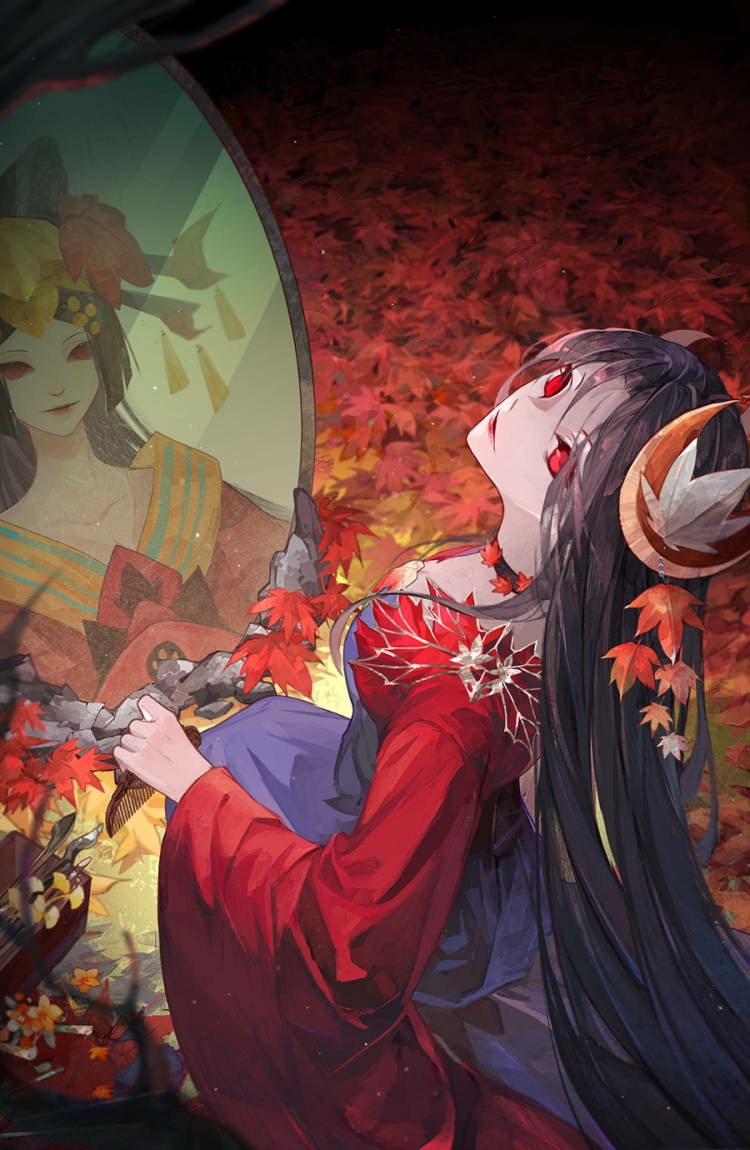 1girl comb hair_ornament holding holding_comb japanese_clothes kokorogari_kijo_momiji leaf leaf_hair_ornament long_hair looking_back maple_leaf mirror mirror_image onmyoji red_eyes reflection sitting snake937