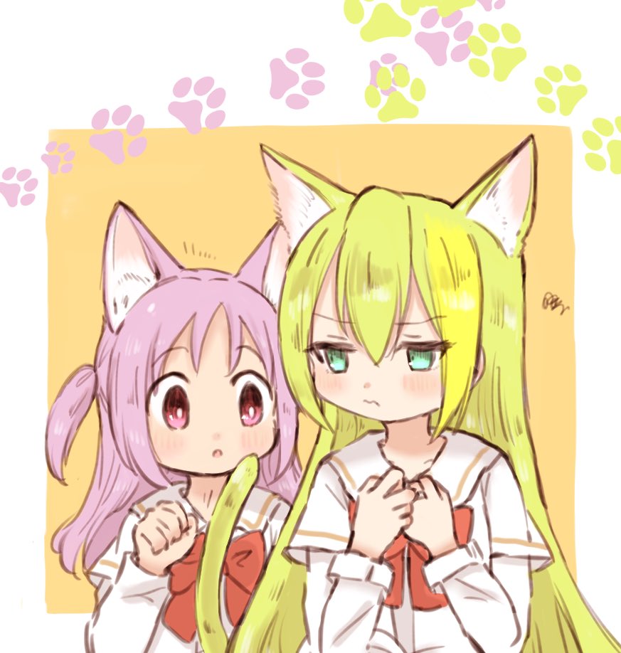 2girls alina_gray animal_ears blonde_hair blush bow bowtie cat_ears closed_mouth embarrassed green_hair hair_between_eyes hands_on_own_chest kemonomimi_mode layered_sleeves long_hair long_sleeves looking_at_another magia_record:_mahou_shoujo_madoka_magica_gaiden mahou_shoujo_madoka_magica medium_hair misono_karin multicolored_hair multiple_girls open_mouth parted_bangs paw_print purple_hair red_bow red_bowtie rin_tarou sakae_general_school_uniform school_uniform shirt short_over_long_sleeves short_sleeves sidelocks straight_hair streaked_hair two_side_up white_shirt wing_collar