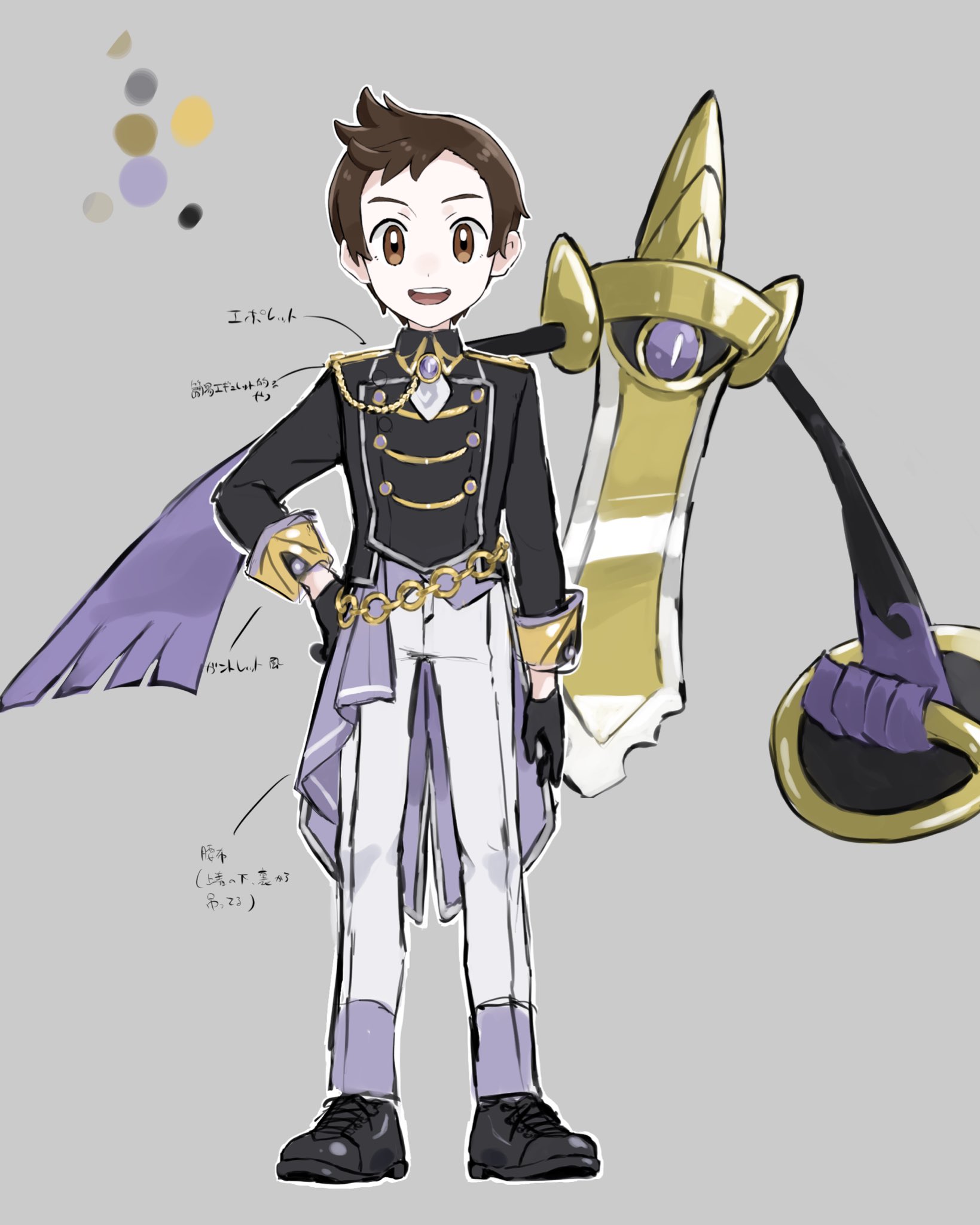 1boy :d aegislash alternate_costume black_footwear black_gloves black_jacket brown_eyes brown_hair chain color_guide commentary gen_6_pokemon gloves grey_background hand_on_own_hip highres jacket looking_at_viewer male_focus nintendo open_mouth pants pokemon pokemon_(creature) pokemon_sword_and_shield shoes short_hair smile standing untranslatable_commentary teeth upi_(ukn18pkanother) upper_teeth_only victor_(pokemon) white_pants