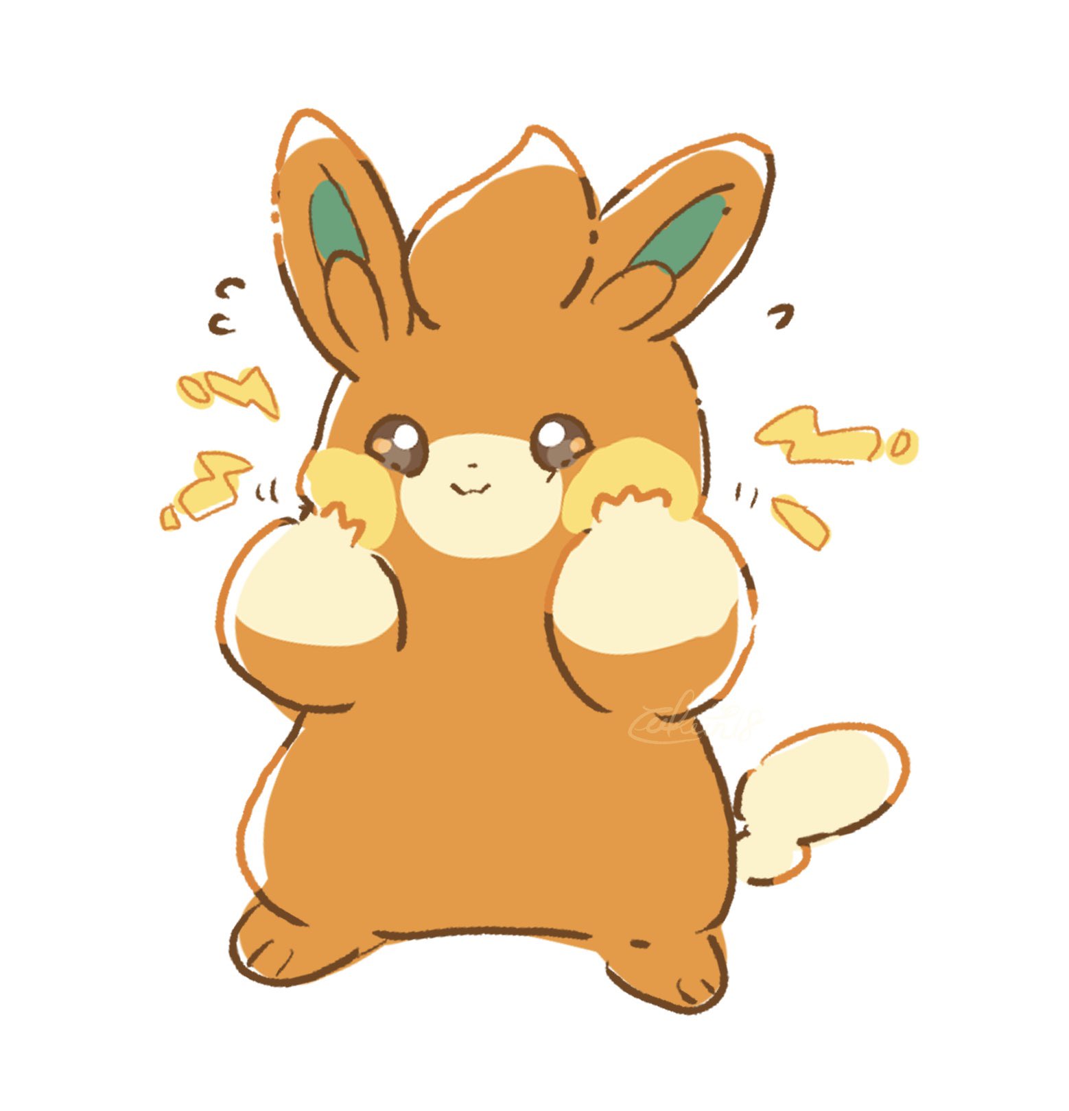 brown_eyes closed_mouth commentary_request flying_sweatdrops full_body hands_up highres nintendo no_humans pawmi pokemon pokemon_(creature) pokemon_focus signature simple_background smile solo standing upi_(ukn18pkanother) white_background