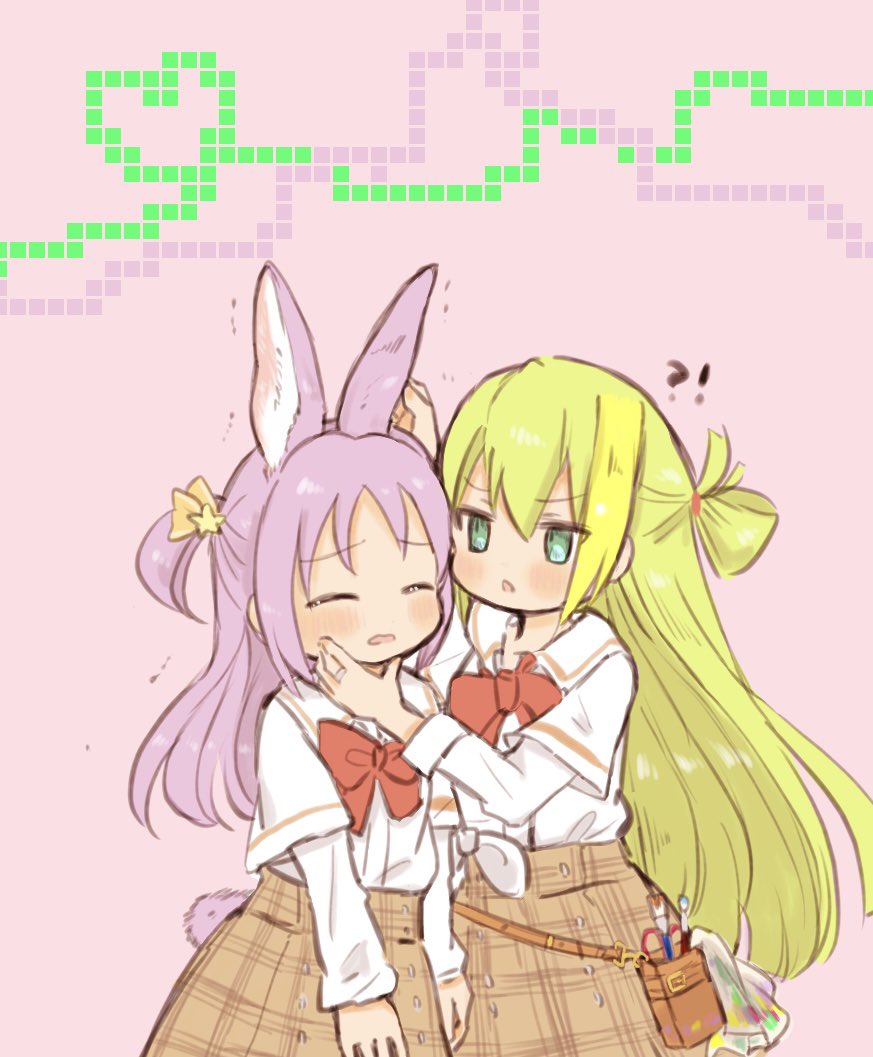 !? 2girls alina_gray animal_ears belt_pouch blonde_hair blush bow bowtie cleaning_rag closed_eyes green_hair hair_between_eyes hair_ornament hair_ribbon hair_rings hand_on_another's_chin kemonomimi_mode layered_sleeves long_hair long_sleeves looking_at_another magia_record:_mahou_shoujo_madoka_magica_gaiden mahou_shoujo_madoka_magica medium_hair misono_karin multicolored_hair multiple_girls open_mouth orange_ribbon paint_stains parted_bangs plaid_clothes plaid_skirt pouch purple_hair rabbit_ears rabbit_tail red_bow red_bowtie ribbon rin_tarou sakae_general_school_uniform school_uniform shirt short_over_long_sleeves short_sleeves side-tie_shirt sidelocks simple_background single_hair_ring skirt star_(symbol) star_hair_ornament straight_hair streaked_hair tail trembling two_side_up white_shirt