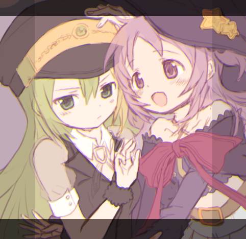 2girls alina_gray black_headwear black_vest blonde_hair blush bow closed_mouth green_eyes green_hair hair_between_eyes hat long_hair lowres magia_record:_mahou_shoujo_madoka_magica_gaiden magical_girl mahou_shoujo_madoka_magica misono_karin multicolored_hair multiple_girls open_mouth peaked_cap purple_eyes purple_hair roamo sidelocks smile star_(symbol) streaked_hair unfinished vest witch_hat