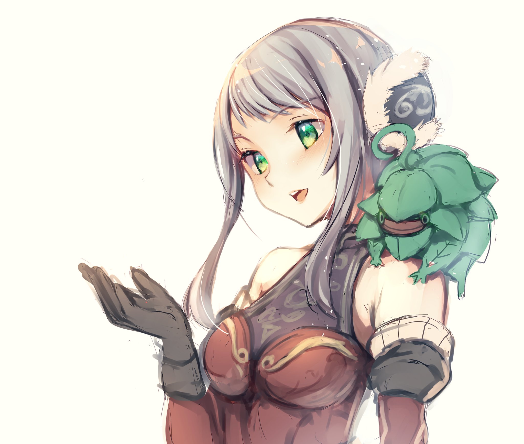 1girl :d arciela_v_adoulin bare_shoulders black_gloves blush breasts covered_collarbone creature detached_sleeves earmuffs eyelashes final_fantasy final_fantasy_xi fur_trim gloves green_eyes green_pupils grey_hair hand_up highres leaf leafkin light_particles long_hair long_sleeves medium_breasts mu_su_me_bot on_shoulder open_mouth red_sleeves simple_background smile solo teeth upper_body upper_teeth_only white_background
