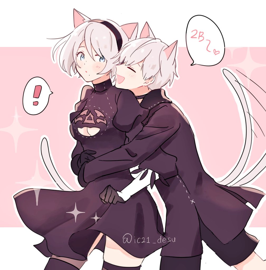 ! 1boy 1girl animal_ears artist_name black_dress blue_eyes cat_boy cat_ears cat_girl cat_tail closed_eyes couple cow_horns dinikee dress heart hetero horns hug hug_from_behind nier:automata nier_(series) short_hair speech_bubble spoken_exclamation_mark tail tail_wagging 2b_(nier:automata) 9s_(nier:automata)