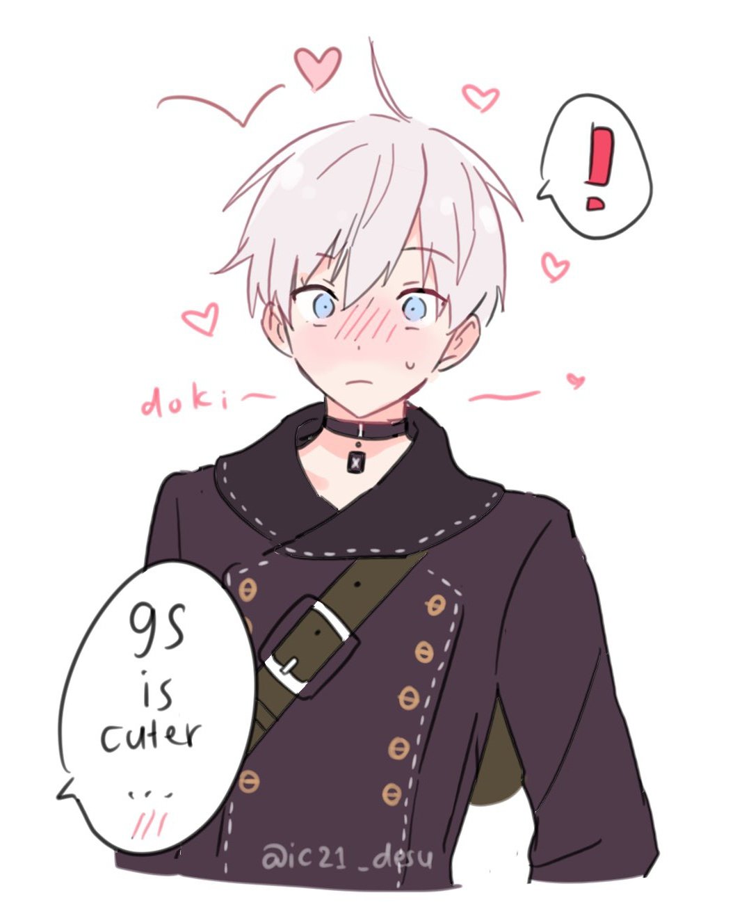 ! 1boy ahoge artist_name bishounen black_coat blue_eyes blush coat cowboy_shot dinikee english_text heart highres male_focus nier:automata nier_(series) short_hair solo speech_bubble spoken_exclamation_mark sweat white_hair 9s_(nier:automata)