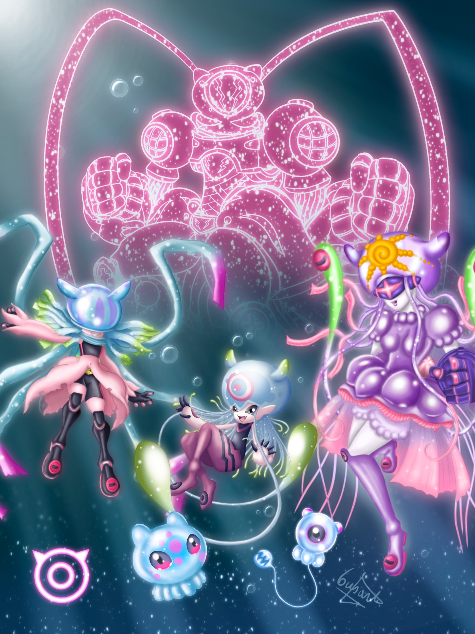 amphimon android armor digimon diving_suit evolutionary_line full_armor gynoid highres jellyfish jellyfish_girl jellymon mask mecha_girl monster_girl puyomon puyoyomon robot_girl tentacle_hair tentacles teslajellymon thetismon