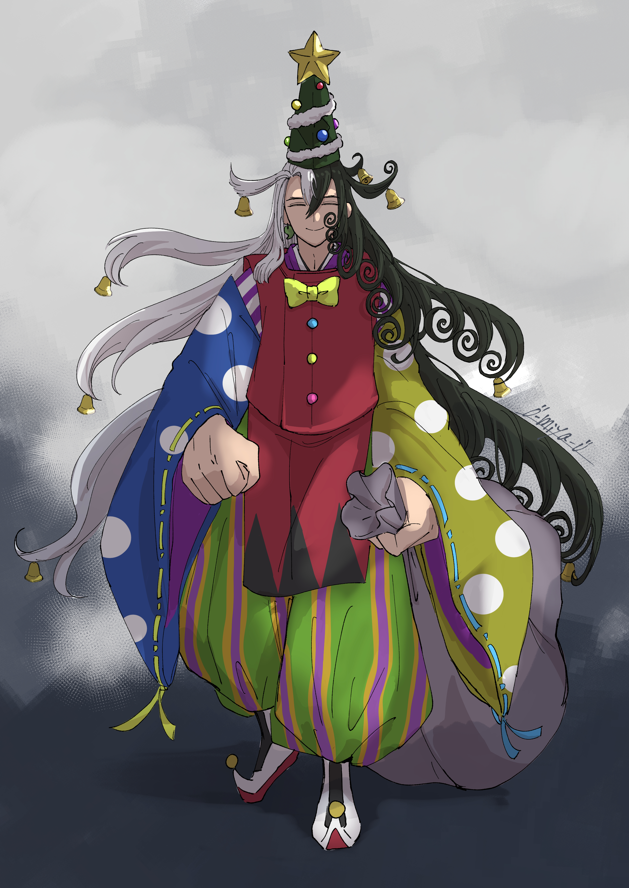 1boy ^_^ absurdres alternate_costume ashiya_douman_(fate) asymmetrical_hair bell black_eyes black_hair christmas christmas_tree_costume christmas_tree_hair_ornament closed_eyes curly_hair earrings fate/grand_order fate_(series) full_body gift_bag hair_bell hair_between_eyes hair_intakes hair_ornament highres jewelry kick_back_(song) large_hands long_hair magatama magatama_earrings male_focus multicolored_hair o-miya_(ohmiya_you) oversized_limbs parody smile solo standing two-tone_hair very_long_hair white_hair