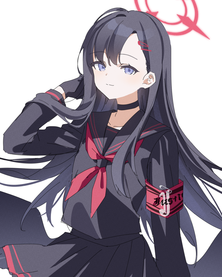 1girl armband black_choker black_gloves black_hair black_serafuku blue_archive choker gloves hair_ornament hairpin halo ichika_(blue_archive) neckerchief nekoln purple_eyes red_armband red_neckerchief school_uniform serafuku unusually_open_eyes