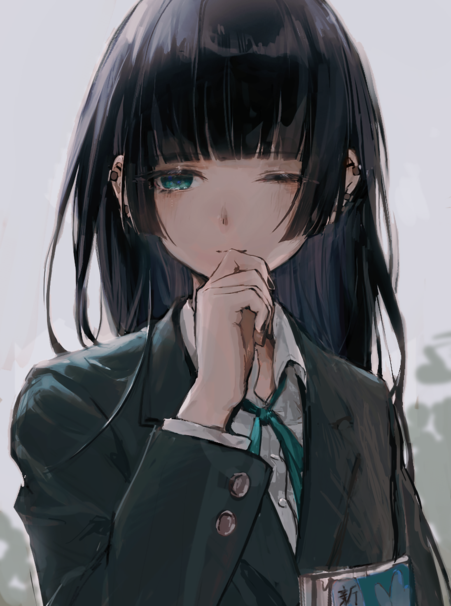 1girl black_hair black_jacket blazer blunt_bangs bocchi_the_rock! closed_mouth collared_shirt commentary_request dress_shirt earrings green_eyes grey_background half-closed_eye hand_up highres jacket jewelry light_smile long_hair long_sleeves looking_at_viewer pa-san school_uniform shirt simple_background solo tentsuu_(tentwo) white_shirt