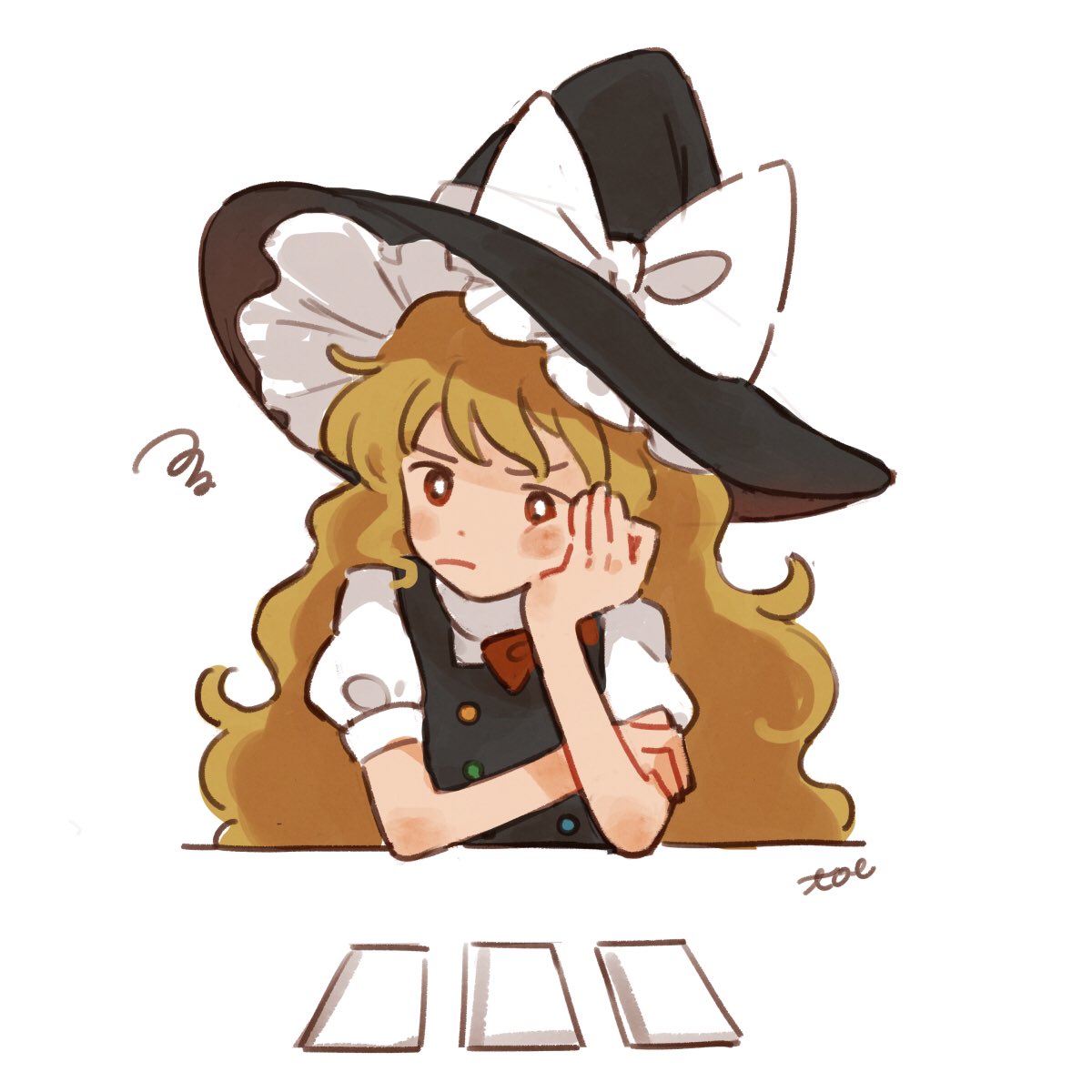 100th_black_market 1girl black_vest blonde_hair bow braid bright_pupils card commentary_request hand_on_own_cheek hand_on_own_face hat hat_bow highres kirisame_marisa long_hair red_bow shirt short_sleeves signature simple_background single_braid solo squiggle toe_miyama touhou upper_body vest wavy_hair white_background white_bow white_shirt witch_hat