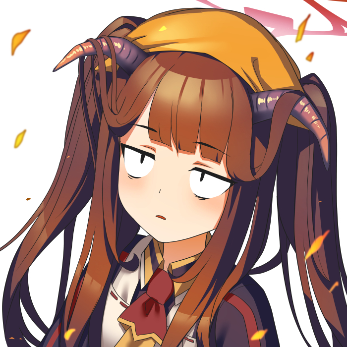 1girl black_hair black_horns blue_archive blunt_bangs embers fuuka_(blue_archive) halo headscarf horns jitome long_hair long_sleeves looking_up multicolored_necktie necktie orange_headwear parted_lips portrait sanpaku shooka simple_background solo white_background yellow_headscarf