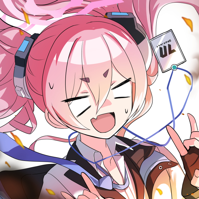 1girl :d blank_eyes blue_archive blue_necktie collared_shirt double_fox_shadow_puppet dress_shirt explosion fang floating_hair fox_shadow_puppet hair_between_eyes hands_up jacket koyuki_(blue_archive) lanyard long_hair necktie open_mouth pink_hair shirt shooka short_eyebrows simple_background smile solo sweat thick_eyebrows twintails upper_body white_background white_jacket white_shirt