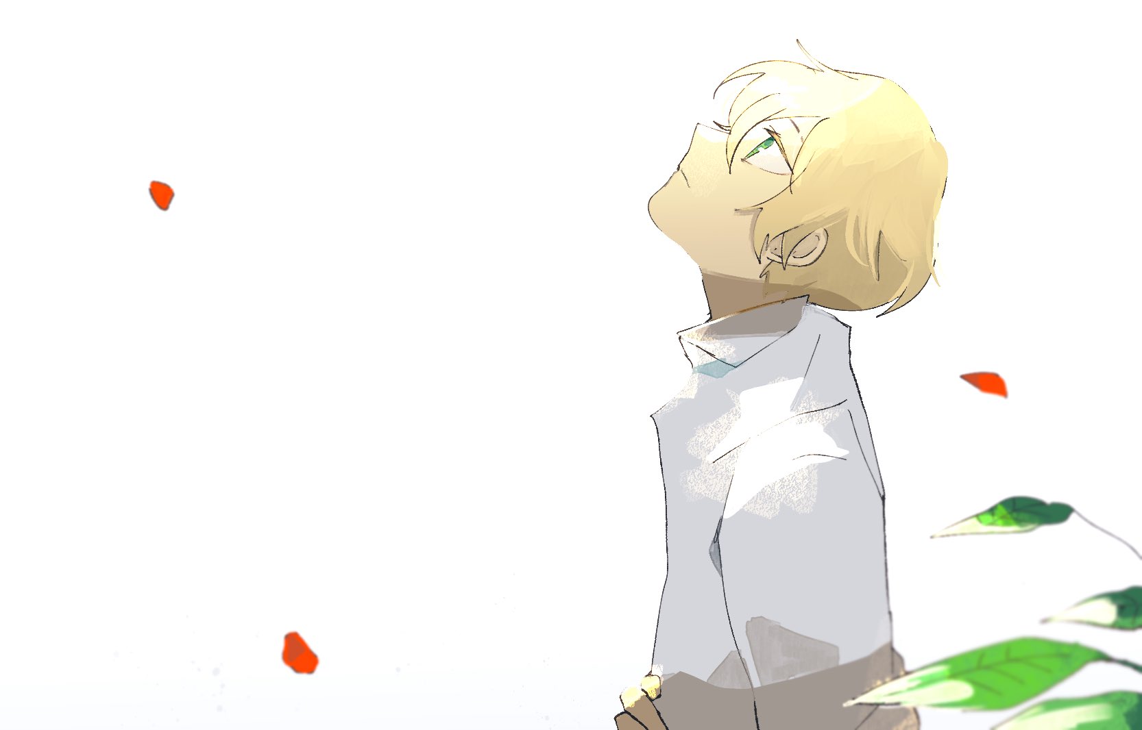 1boy blonde_hair child closed_mouth collar_x_malice collared_shirt expressionless green_eyes highres leaf looking_up male_focus miya00san petals shiraishi_kageyuki shirt short_hair solo white_background white_shirt