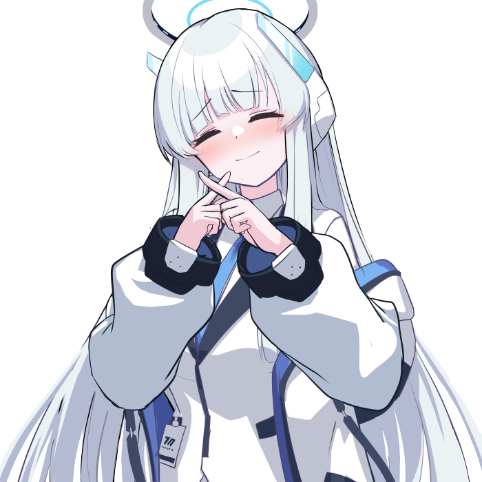 1girl blue_archive blue_necktie blush closed_eyes crossed_fingers halo id_card jacket long_hair long_sleeves mechanical_halo necktie noa_(blue_archive) off_shoulder shooka simple_background smile solo white_background white_hair white_jacket x_fingers
