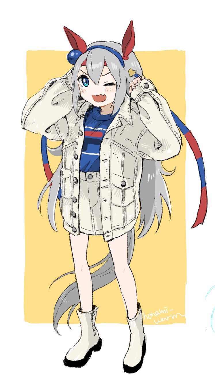 1girl alternate_costume animal_ears blue_eyes blue_shirt blush boots fang fila full_body grey_hair hairband hands_up headband highres horse_ears horse_girl horse_tail inaho_soji long_hair long_sleeves miniskirt one_eye_closed open_mouth shirt skin_fang skirt smile solo standing tail tamamo_cross_(umamusume) twitter_username umamusume white_background white_boots white_skirt