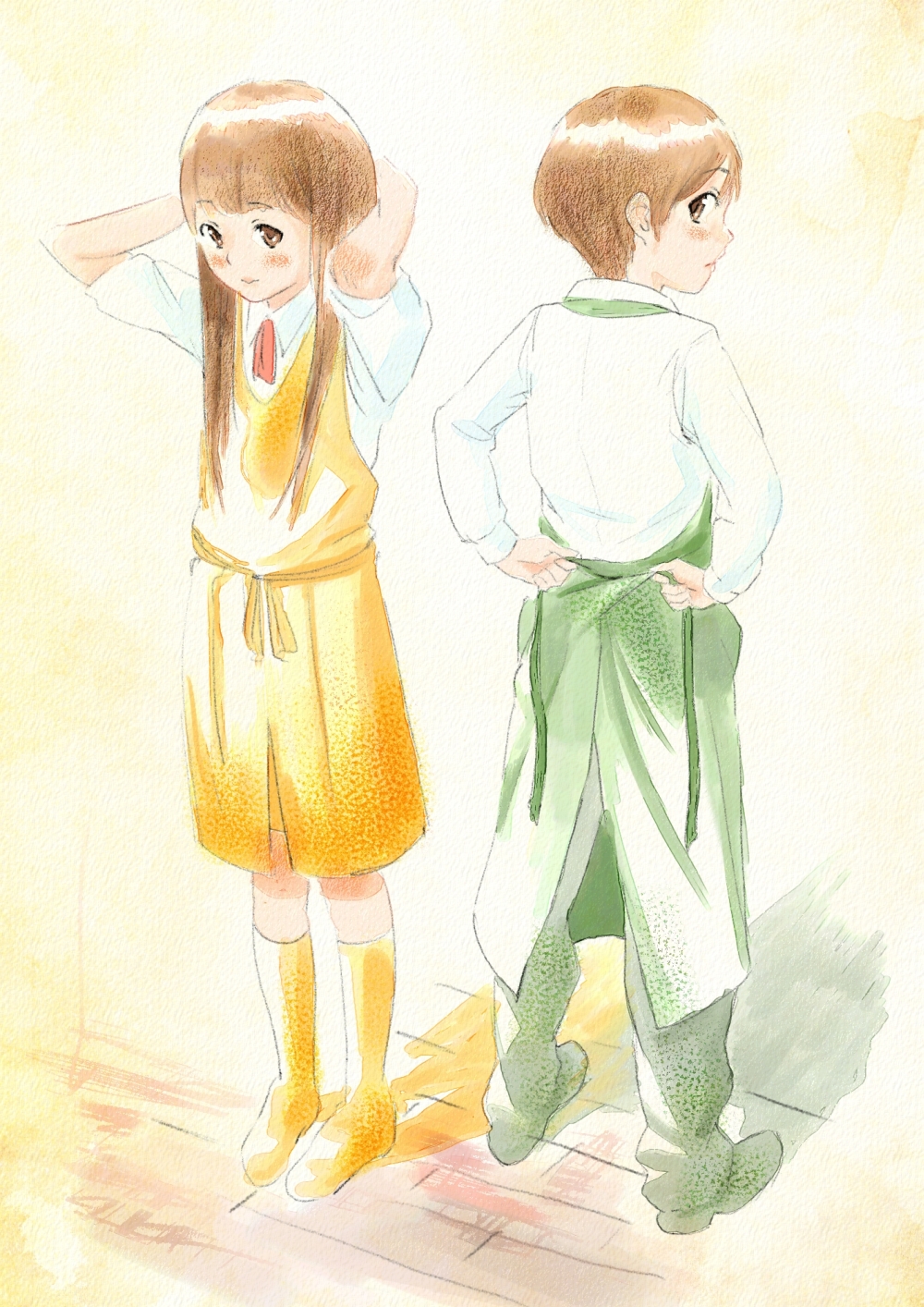 1boy 1girl apron arms_up blush boots brown_eyes brown_hair dress dual_persona frfk gender_transitioning green_apron highres hourou_musuko long_hair long_sleeves nitori_shuuichi painting_(medium) pants shirt short_hair short_sleeves smile traditional_media watercolor_(medium) white_shirt wooden_floor yellow_boots yellow_dress
